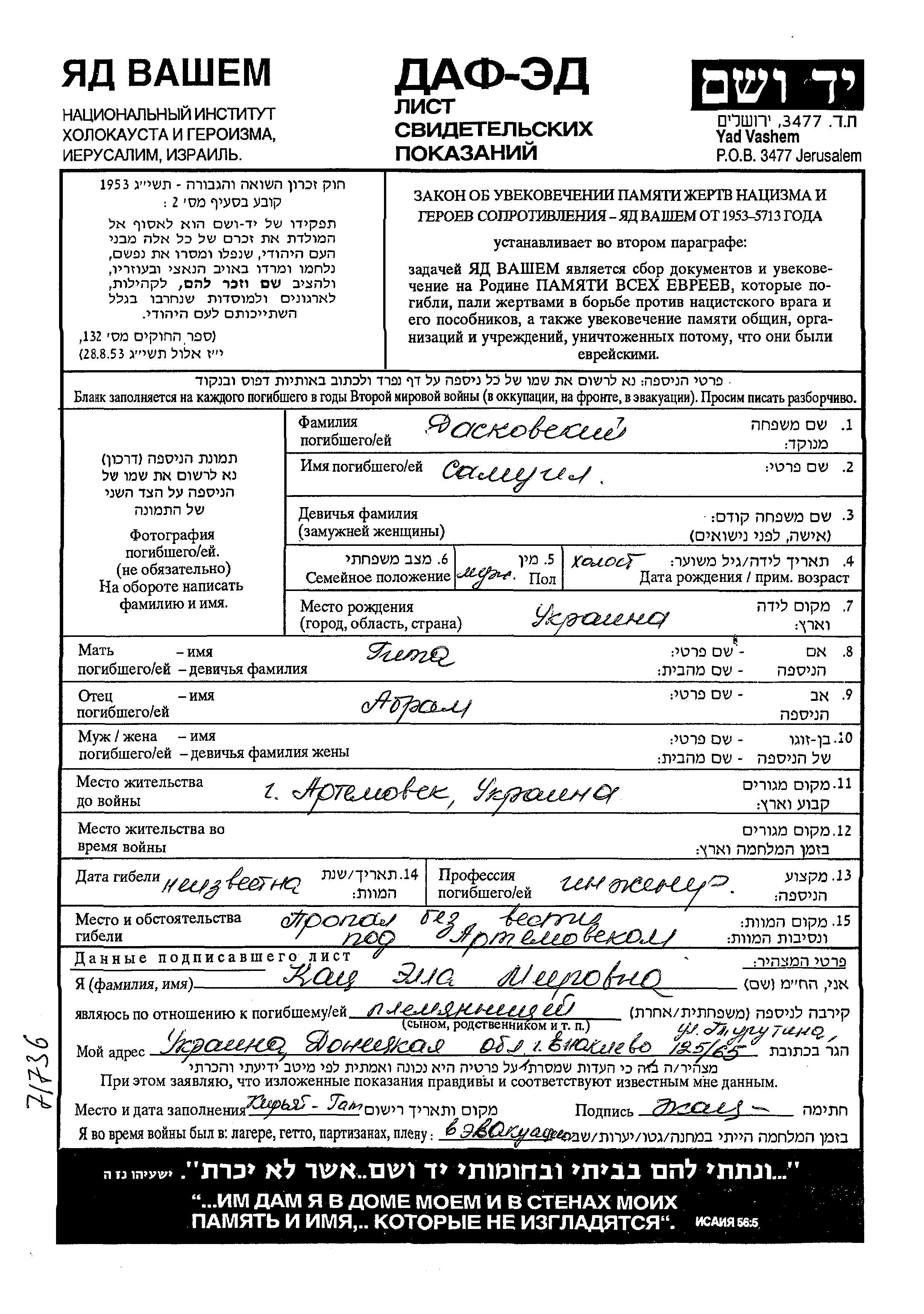 Samuil wurde in der Schoah ermordet. Todesort: Artemovsk, Ukraine (UdSSR).