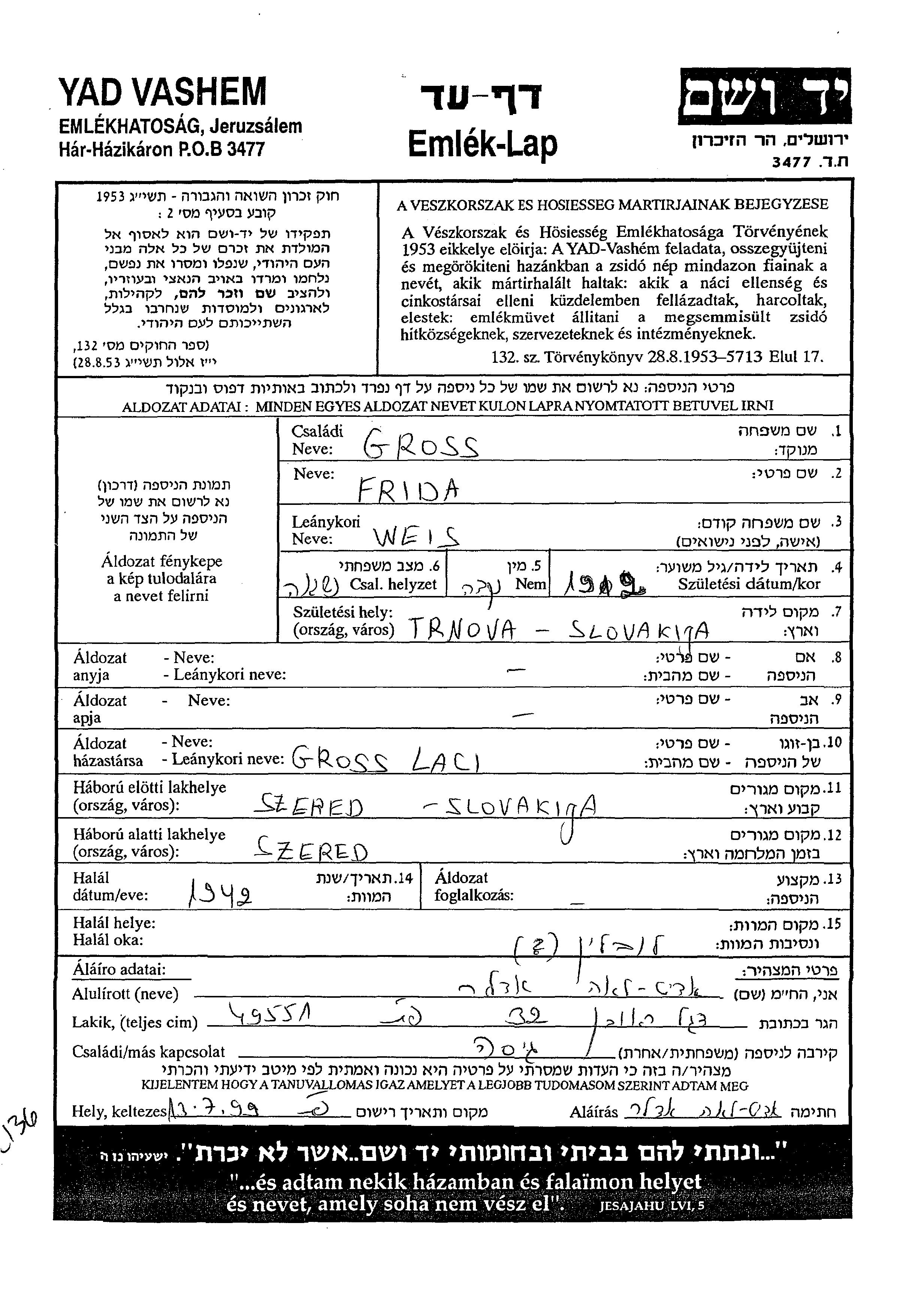 Frida Gross, geb. Weis wurde im Jahr 1912 in Trnovany, Tschechoslowakei geboren. Sie war mit Laci Verheiratet. Vor dem Zweiten Weltkrieg lebte sie in Szered, Tschechoslowakei. Während des Krieges war sie in Szered, Tschechoslowakei.
