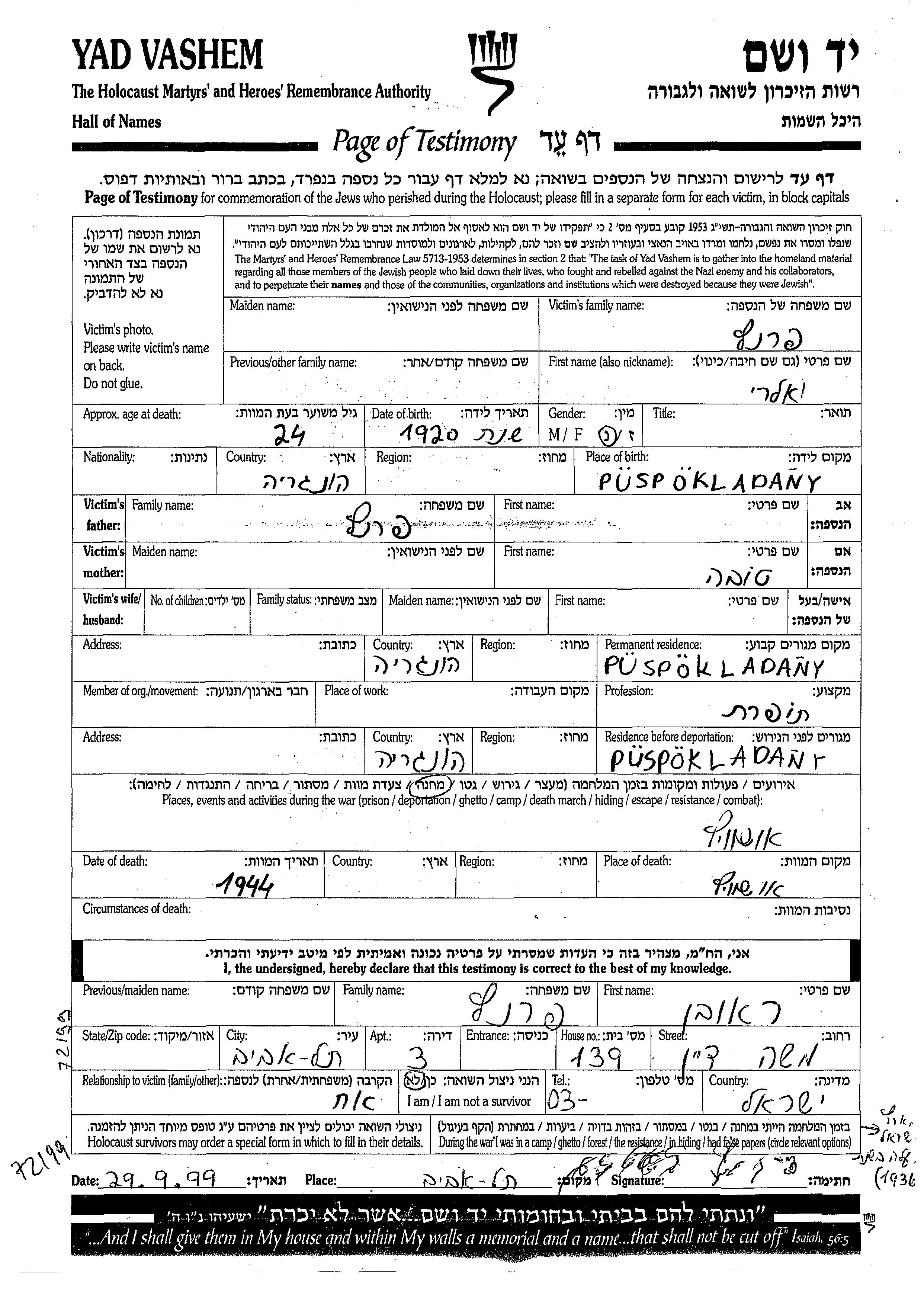 Valeri Frantz wurde im Jahr 1920 in Puspokladany, Ungarn geboren. Sie war die Tochter von Tova. Sie war Schneiderin. Vor dem Zweiten Weltkrieg lebte sie in Puspokladany, Ungarn. Während des Krieges war sie in Puspokladany, Ungarn.
