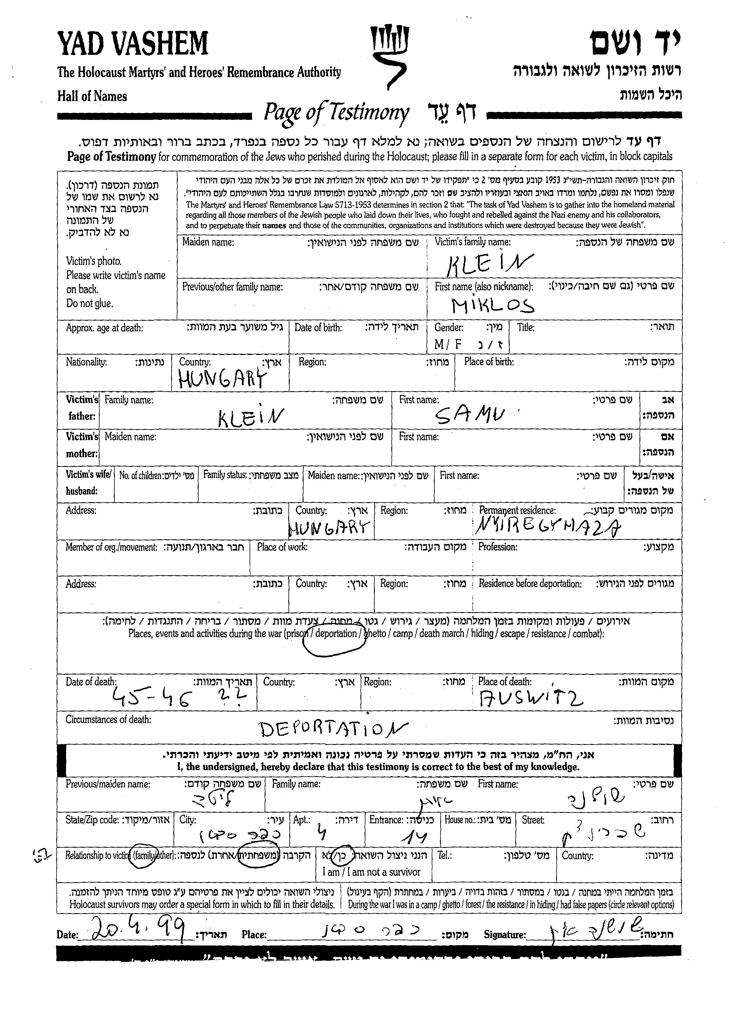 Miklos wurde in der Schoah ermordet. Todesort: Auschwitz, Polen im Jahr 1945.