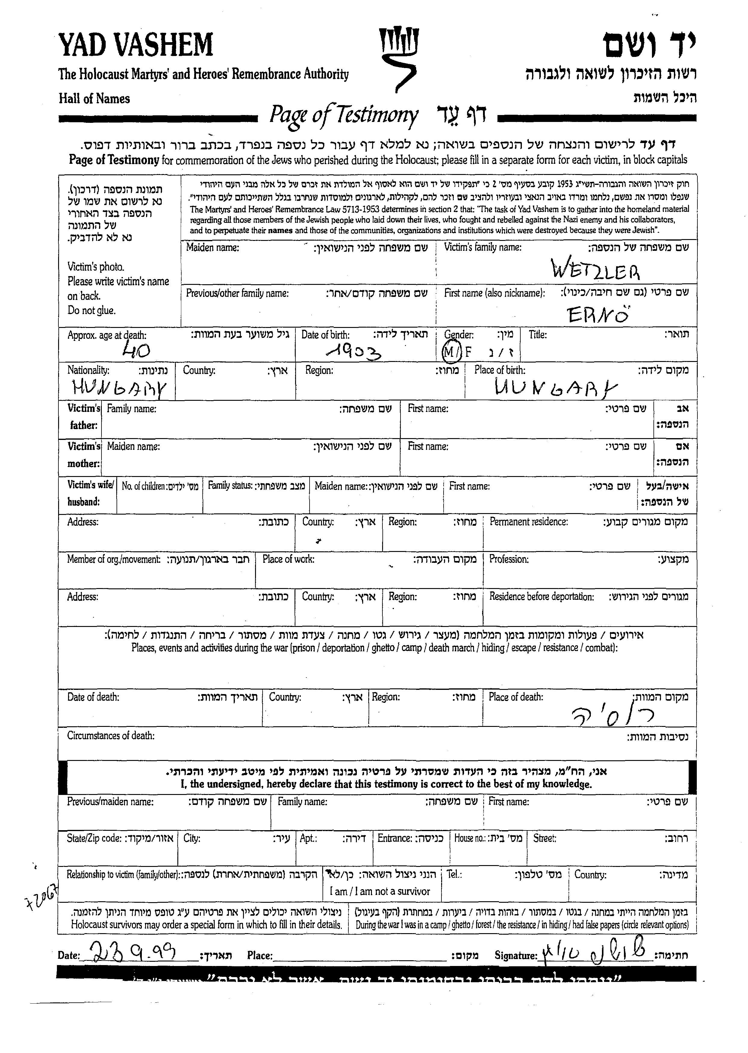 Erno Wetzler wurde im Jahr 1903 in Ungarn geboren.