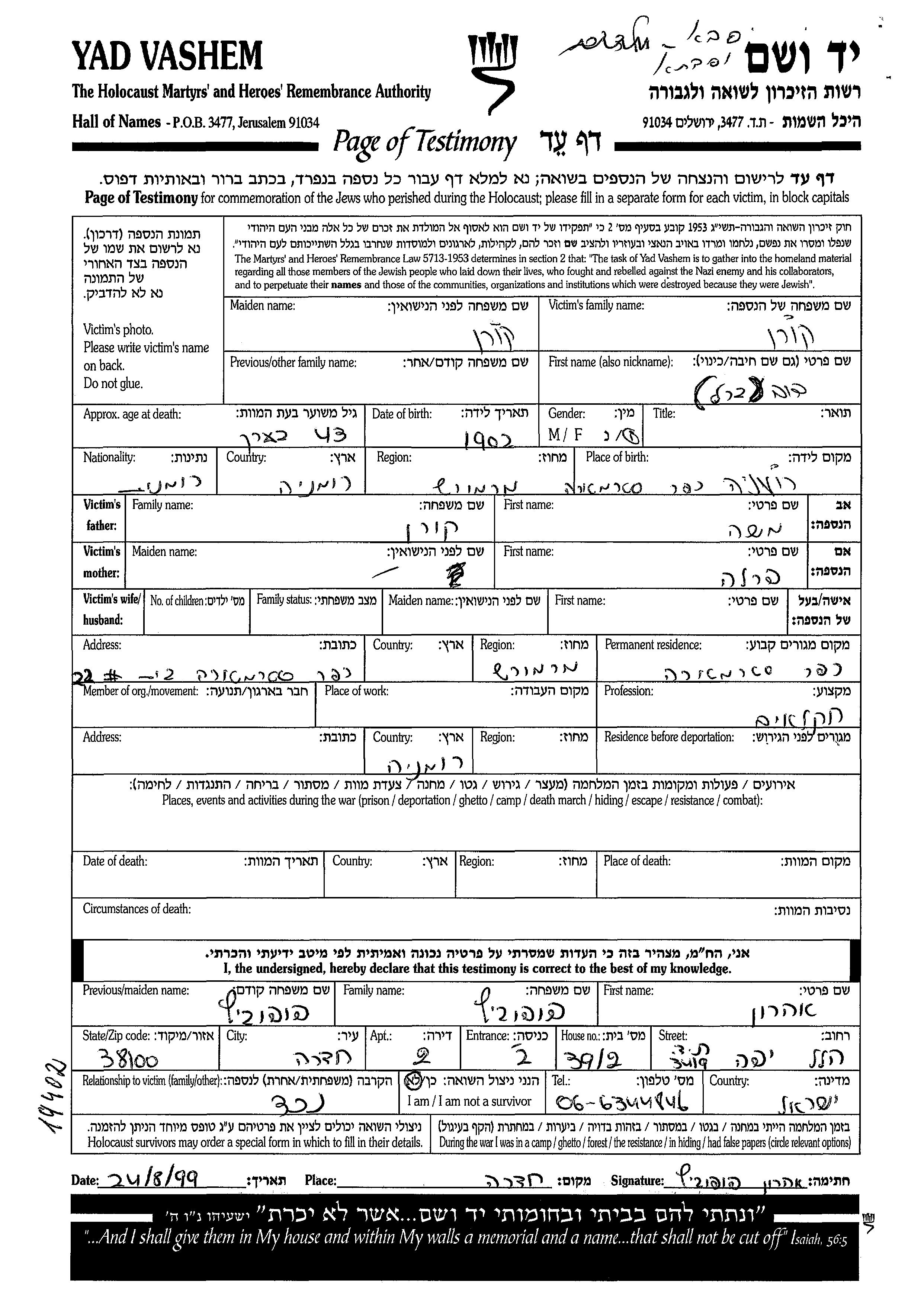 Dov Berl Korn wurde im Jahr 1902 in Stramtura, Rumänien geboren. Er war der Sohn von Moshe und Perla. Er war Landwirt. Vor dem Zweiten Weltkrieg lebte er in Stramtura, Rumänien. Während des Krieges war er in Rumänien.