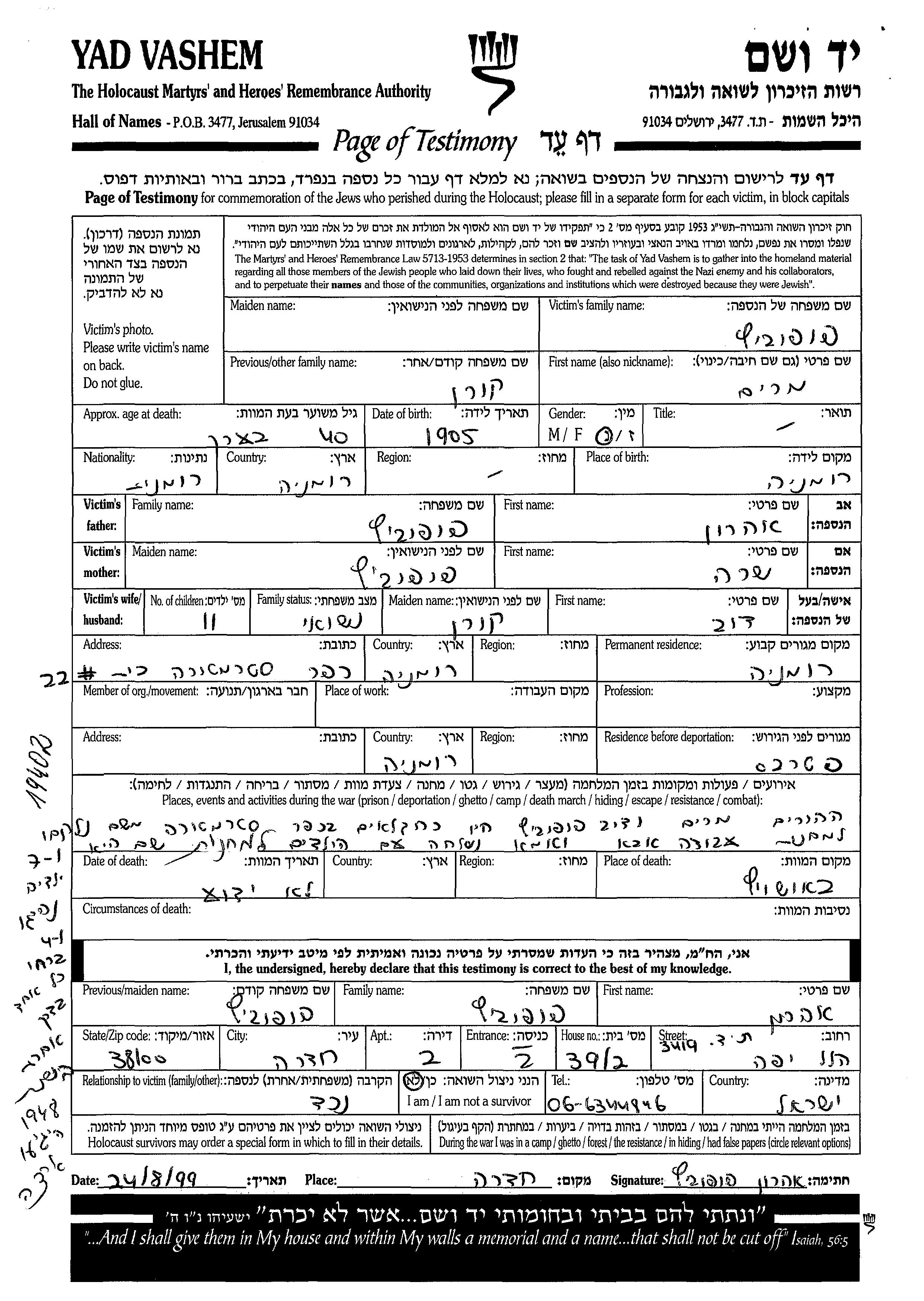 Miriam Popovich Korn, geb. Popovich wurde im Jahr 1905 in Rumänien geboren. Sie war die Tochter von Aharon und Sara. Sie war mit Dov Verheiratet. Vor dem Zweiten Weltkrieg lebte sie in Stramtura, Rumänien. Während des Krieges war sie in Stramtura, Rumänien.