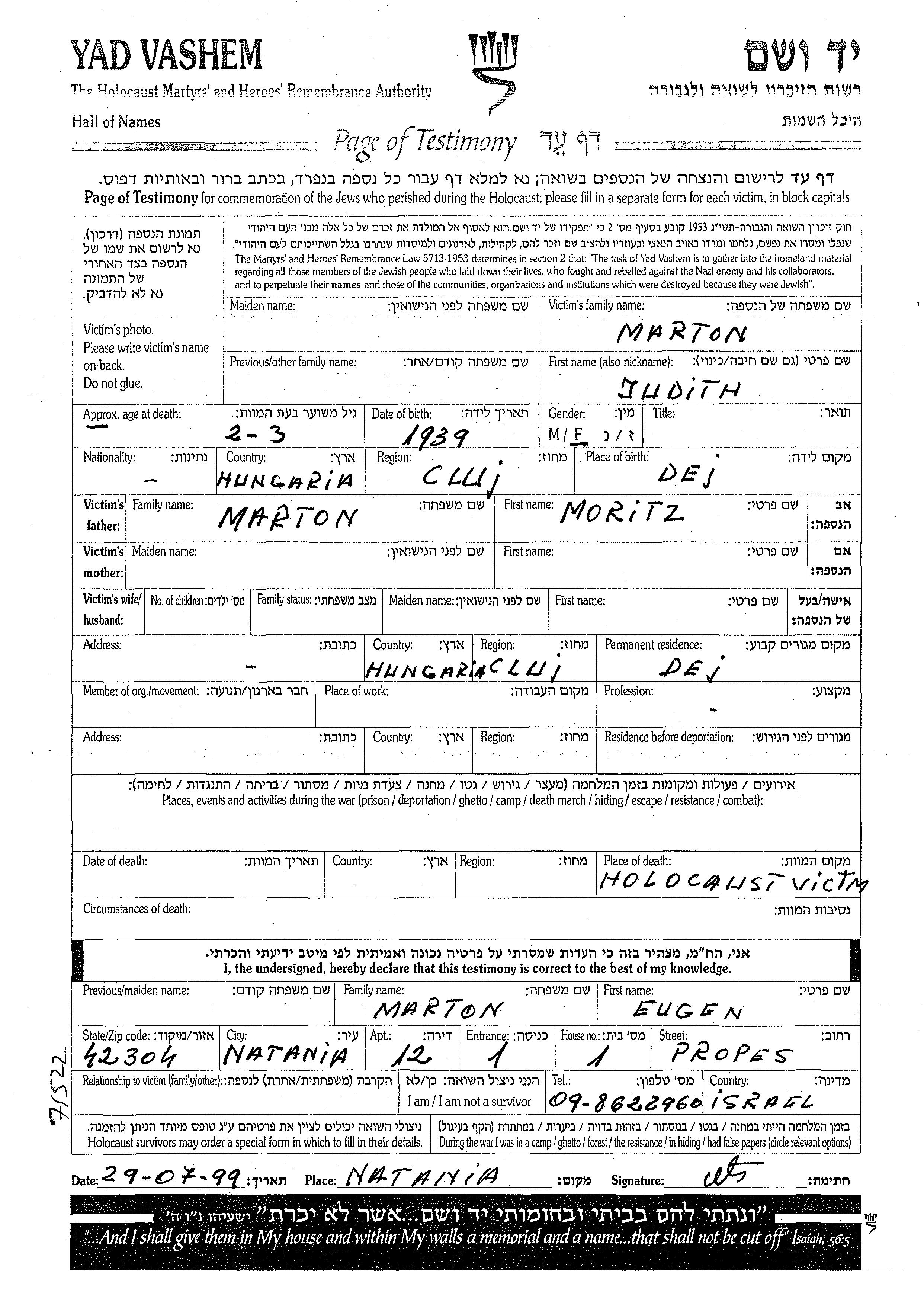 Marton Judith 1939 Dej, Rumänien Gedenkblatt