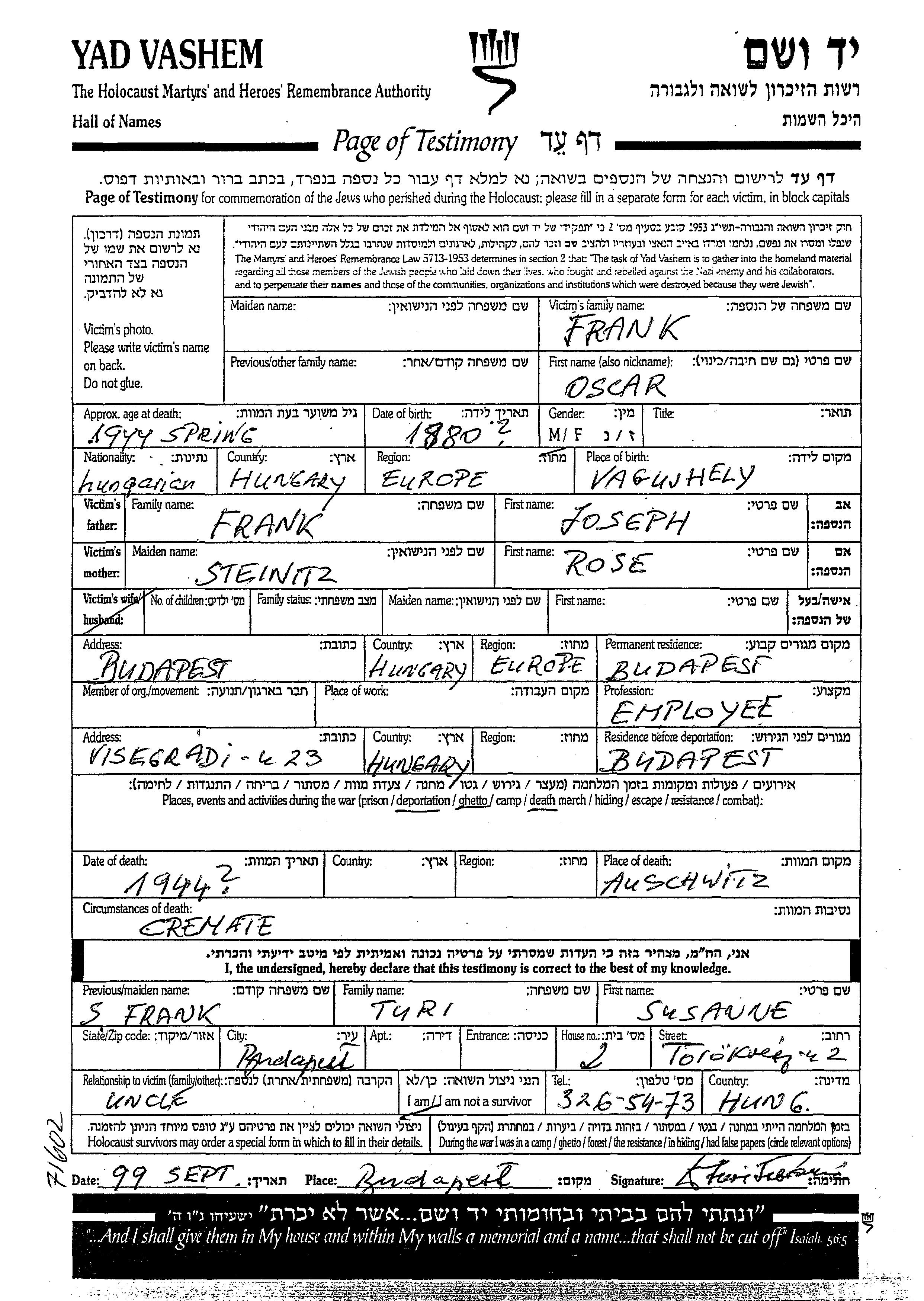 Oscar Frank wurde im Jahr 1880 in Vagujhely, Tschechoslowakei geboren. Er war der Sohn von Joseph und Rose. Er war Angestellte/-r. Vor dem Zweiten Weltkrieg lebte er in Budapest, Ungarn. Während des Krieges war er in Budapest, Ungarn.