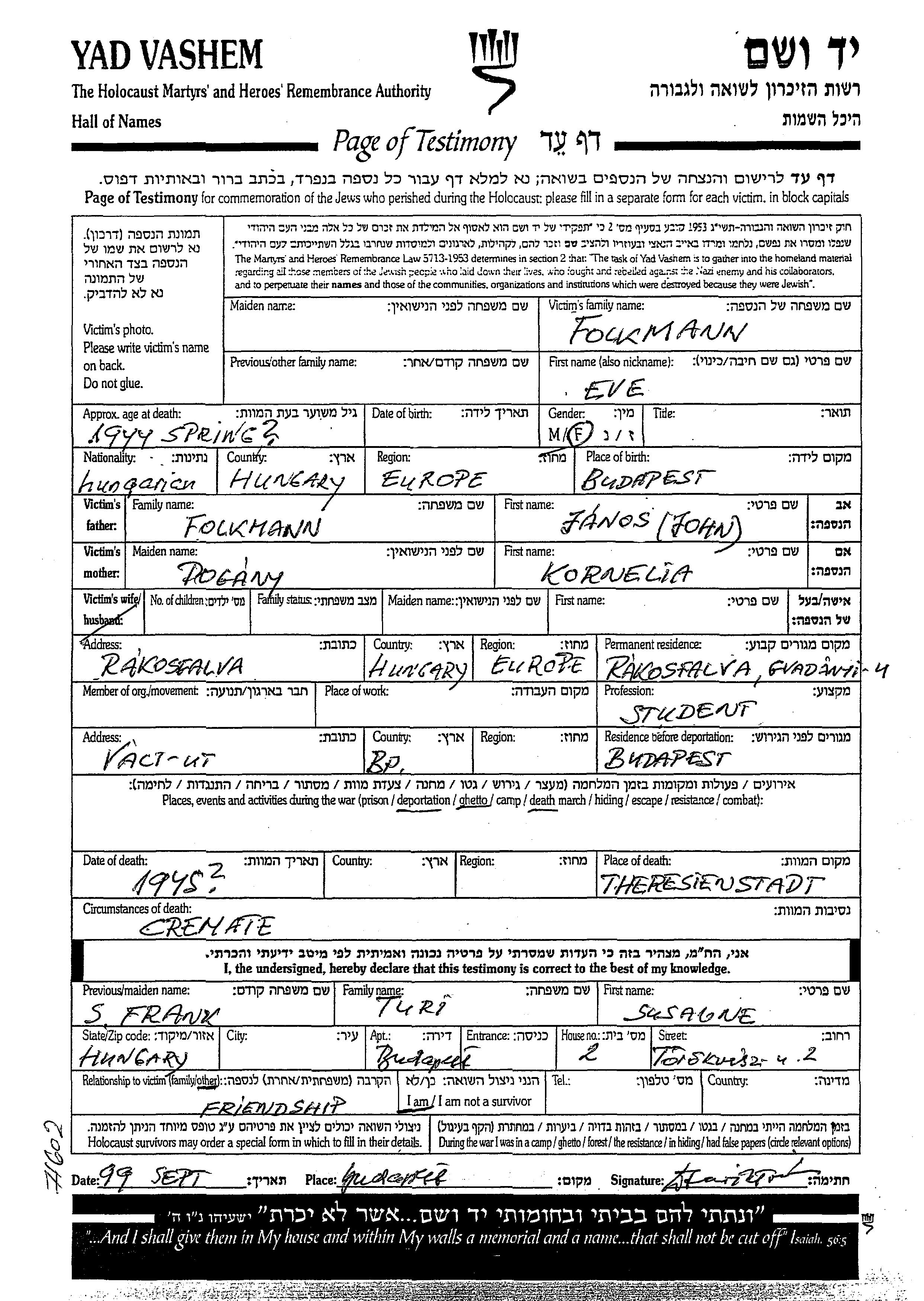 Eve wurde in der Schoah ermordet. Todesort: Theresienstadt, Tschechoslowakei im Jahr 1945.