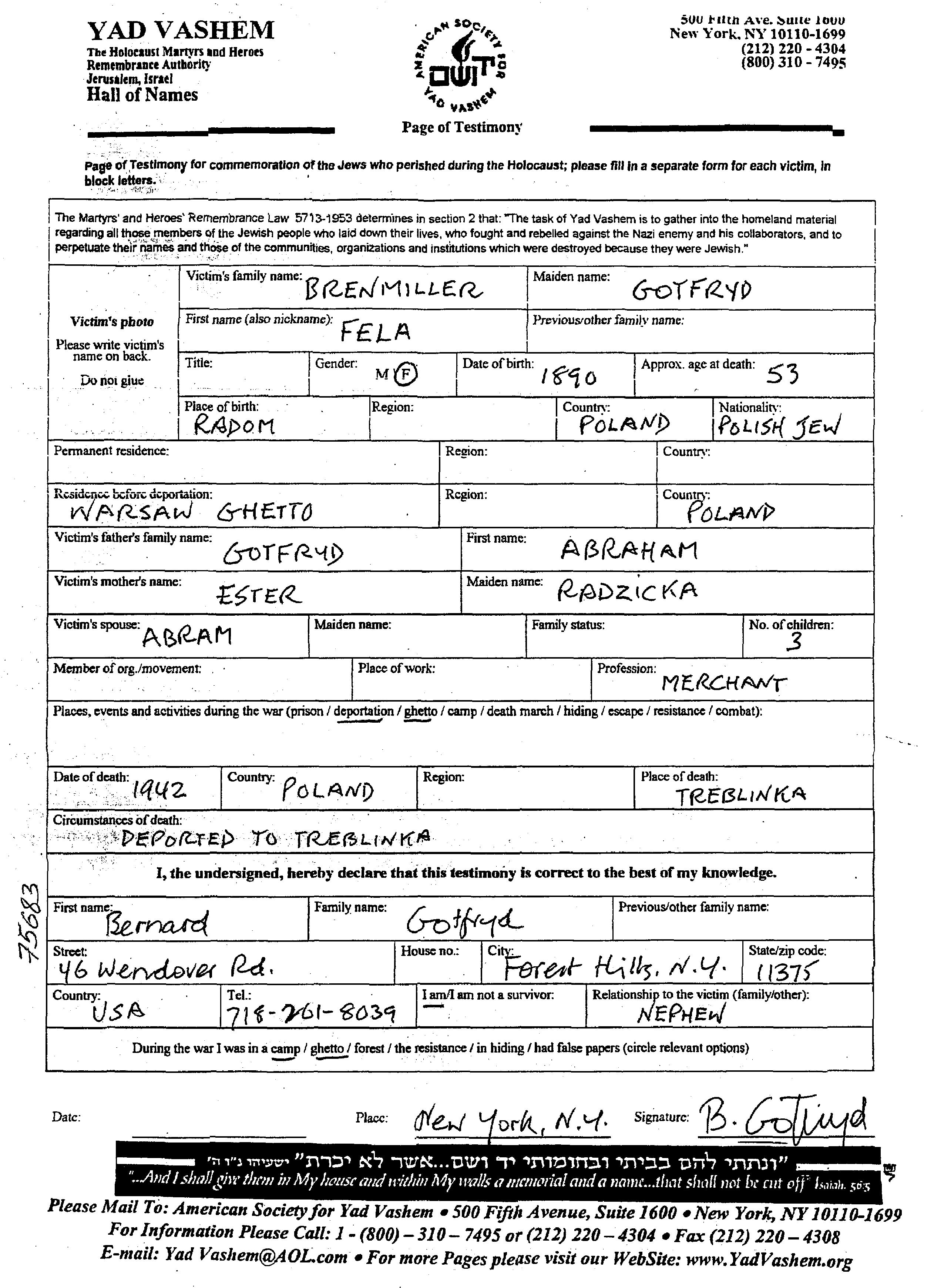 Fela Brenmiller, geb. Gotfryd wurde im Jahr 1890 in Radom, Polen geboren. Sie war die Tochter von Abraham und Ester. Sie war Kaufmann/-frau und mit Abram Verheiratet. Während des Krieges war sie in Warszawa, Polen.