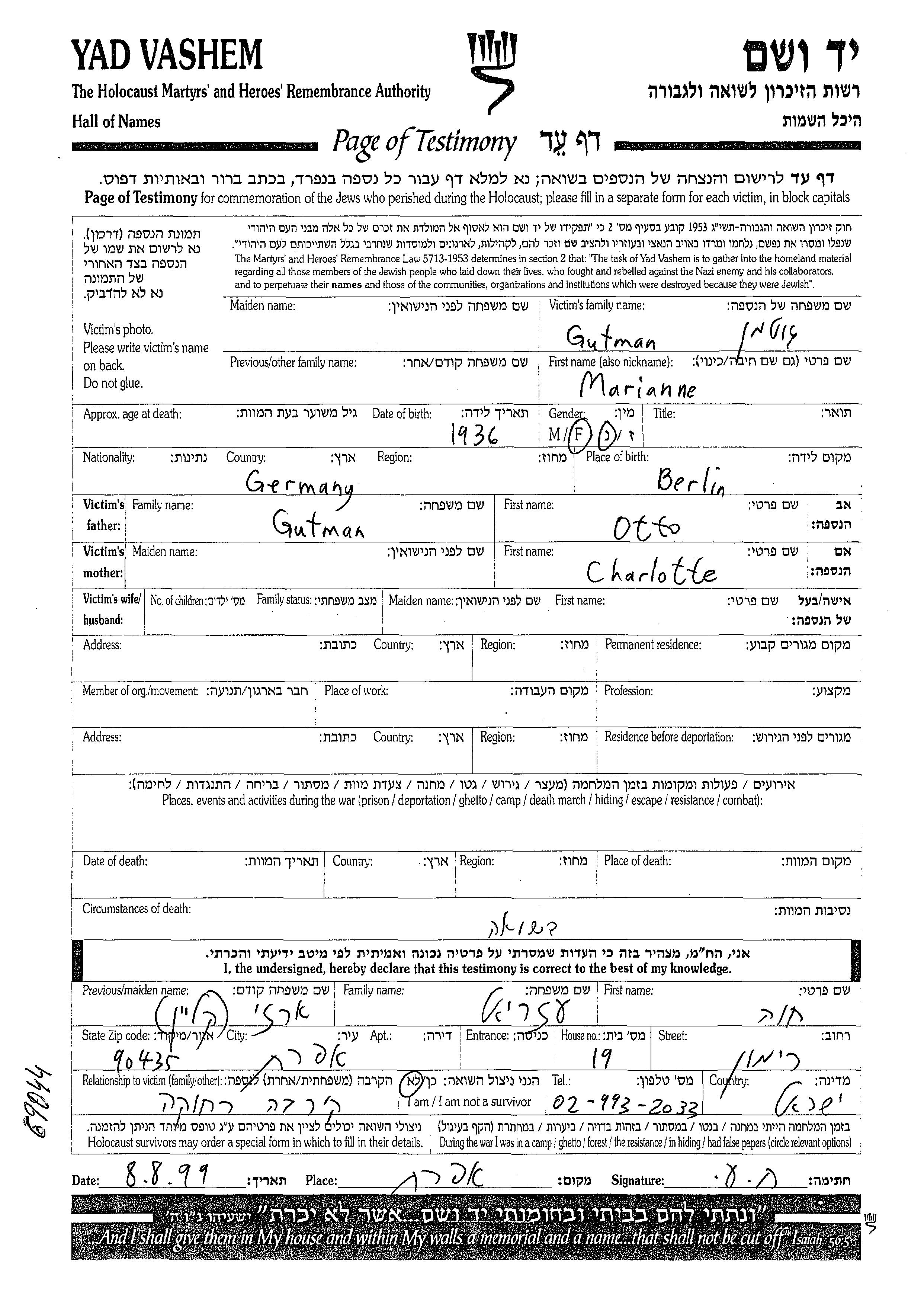 Marianne Gutman wurde im Jahr 1936 in Berlin, Deutsches Reich geboren. Sie war die Tochter von Otto und Charlotte.