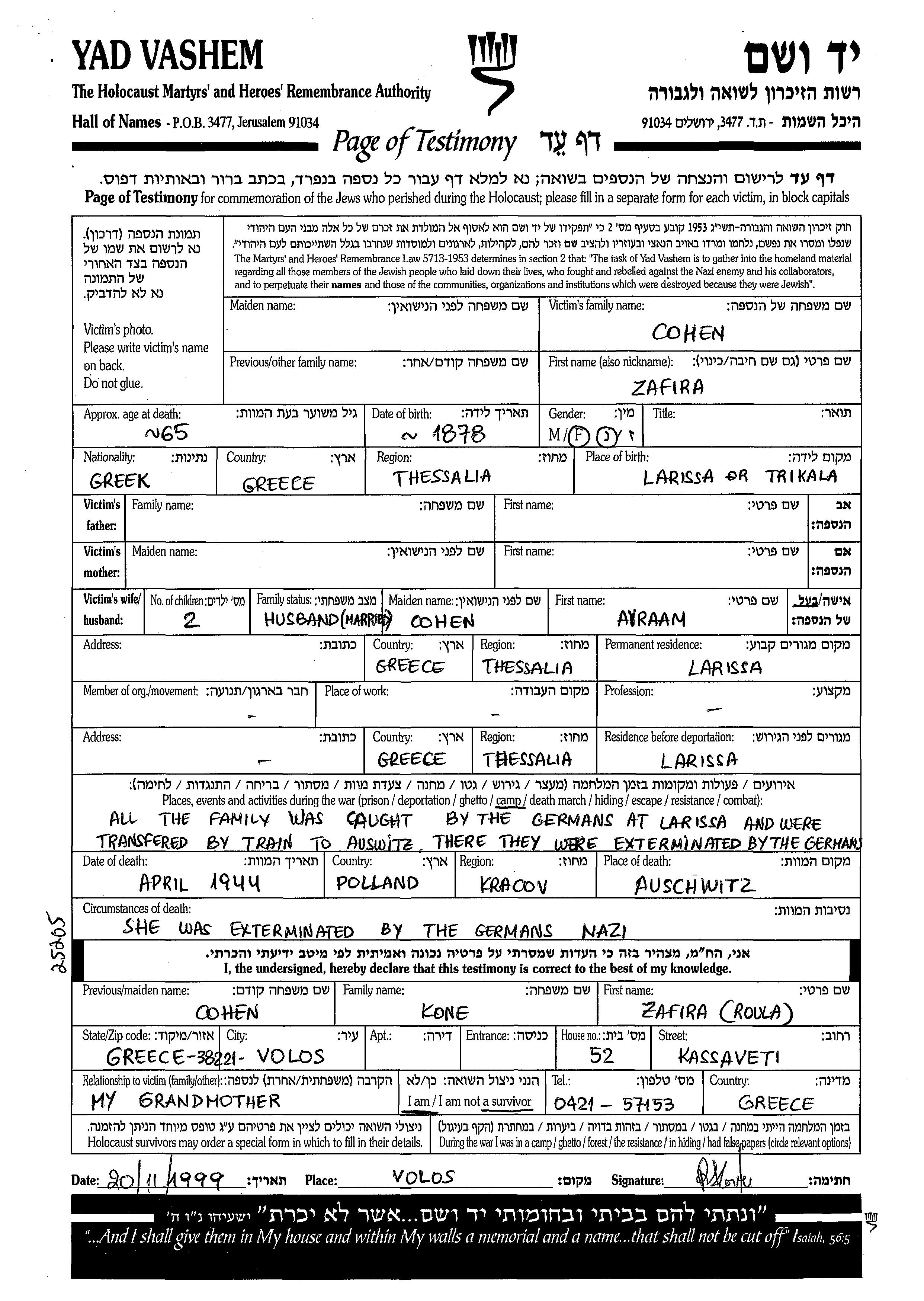 Zafira Cohen wurde im Jahr 1878 in Larissa, Griechenland geboren. Sie war mit Avraam Verheiratet. Vor dem Zweiten Weltkrieg lebte sie in Larissa, Griechenland. Während des Krieges war sie in Larissa, Griechenland.