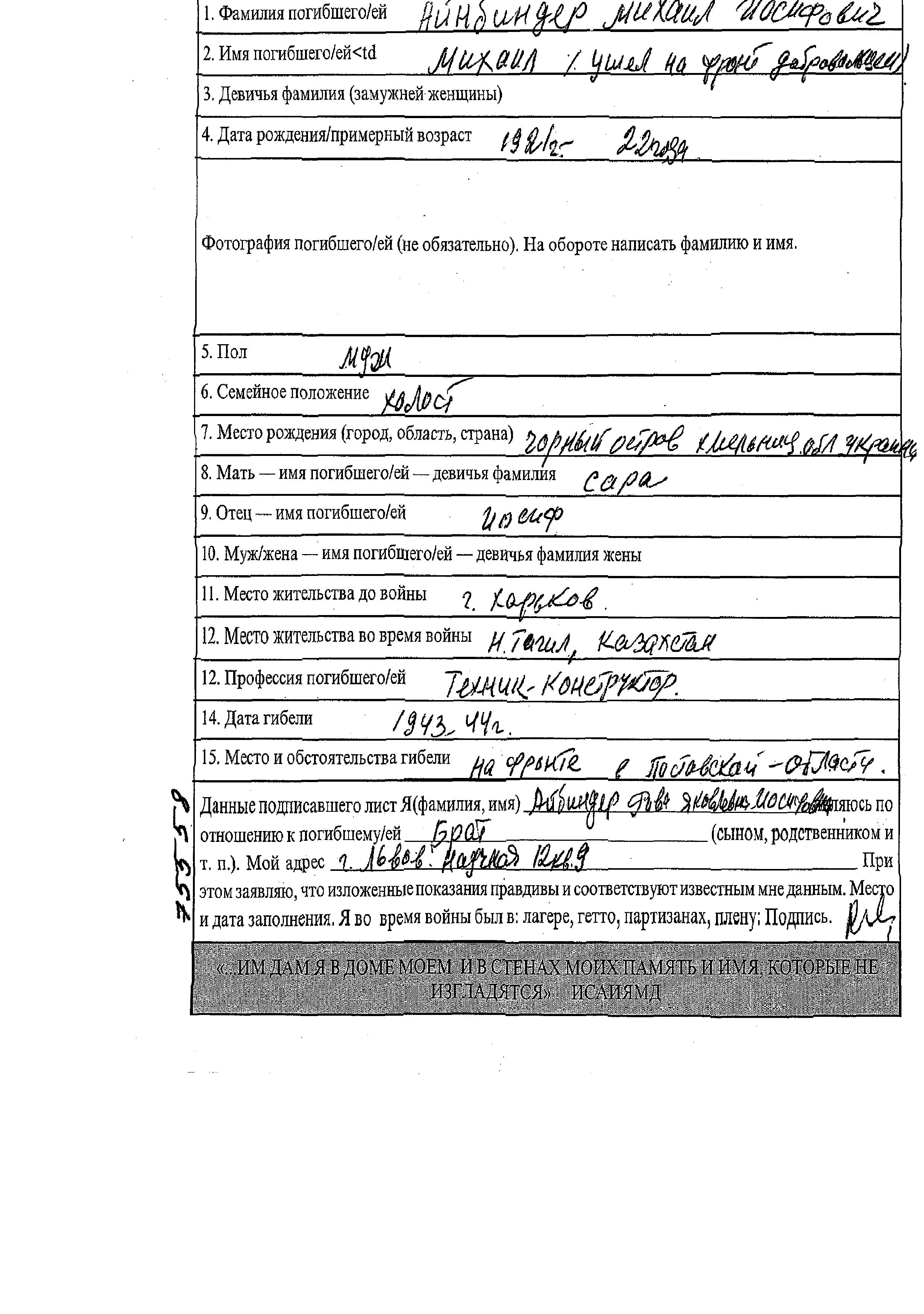 Mikhail Ainbinder wurde im Jahr 1921 in Chorny Ostriv, Ukraine (UdSSR) geboren. Er war der Sohn von Iosif und Sara. Er war Techniker/-in und Ledig. Vor dem Zweiten Weltkrieg lebte er in Kharkov, Ukraine (UdSSR). Während des Krieges war er in die Sowjetischen Streitkräfte. Mikhail im Militärdienst umgekommen. Todesort: Poltava, Ukraine (UdSSR) im Jahr 1943.