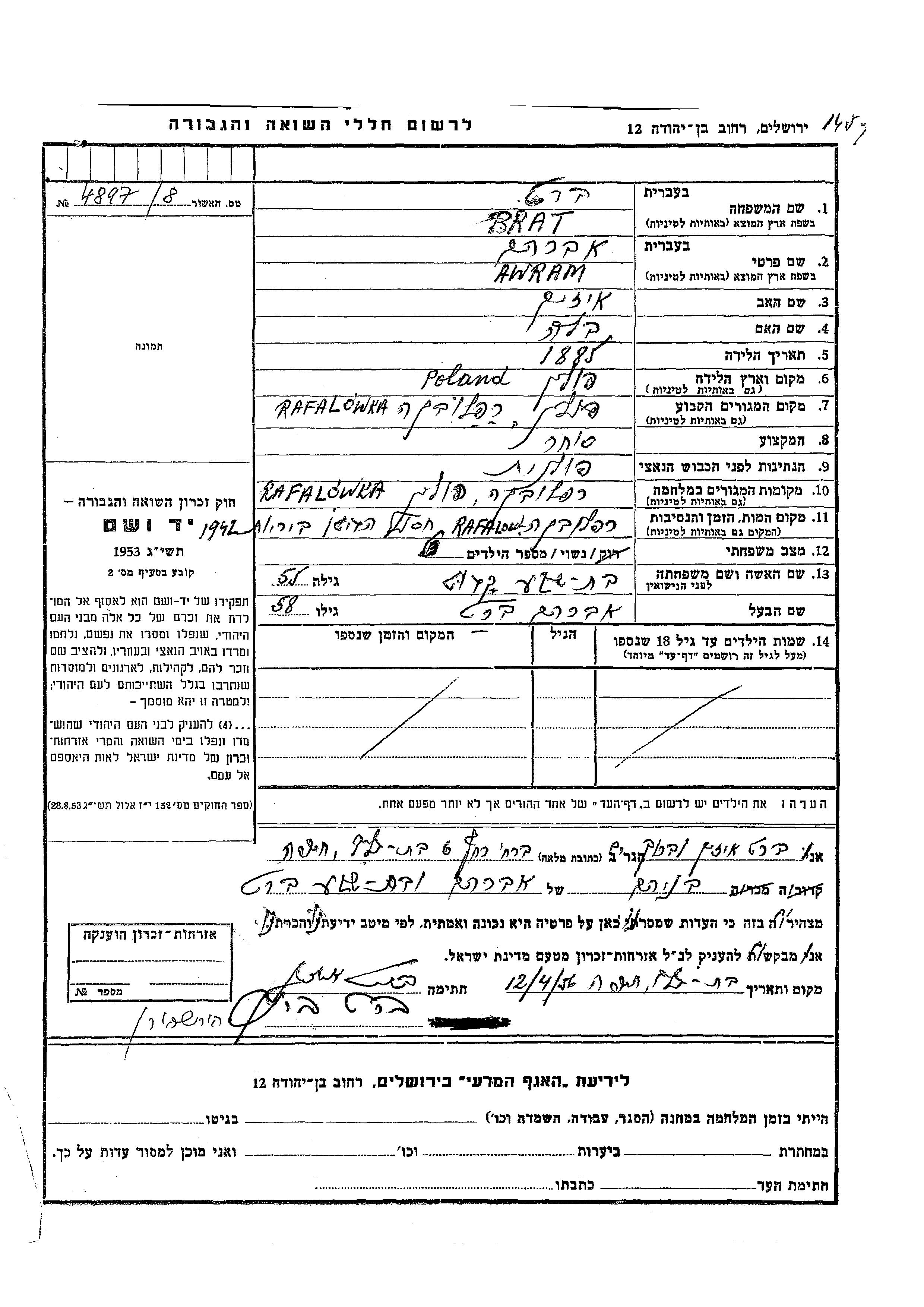 Awram Brat wurde im Jahr 1885 in Polen geboren. Er war der Sohn von Aizik und Bela. Er war Kaufmann/-frau und mit Batsheva, geb. Kogut Verheiratet. Vor dem Zweiten Weltkrieg lebte er in Rafałówka, Polen. Während des Krieges war er in Rafałówka, Polen.
