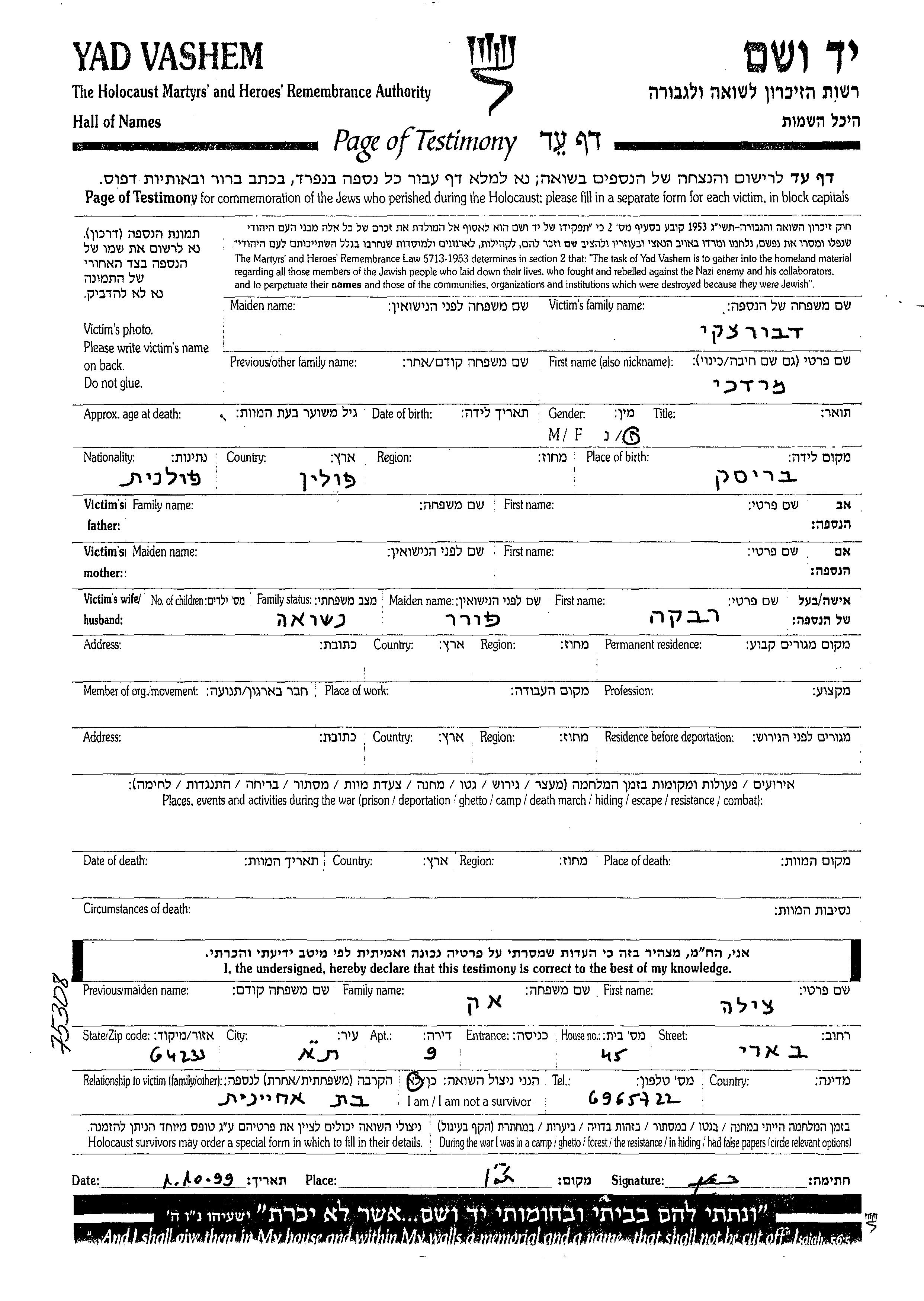 Mordekhai Dvoretzki wurde in Brzesc, Polen geboren. Er war mit Rivka, geb. Furer Verheiratet.