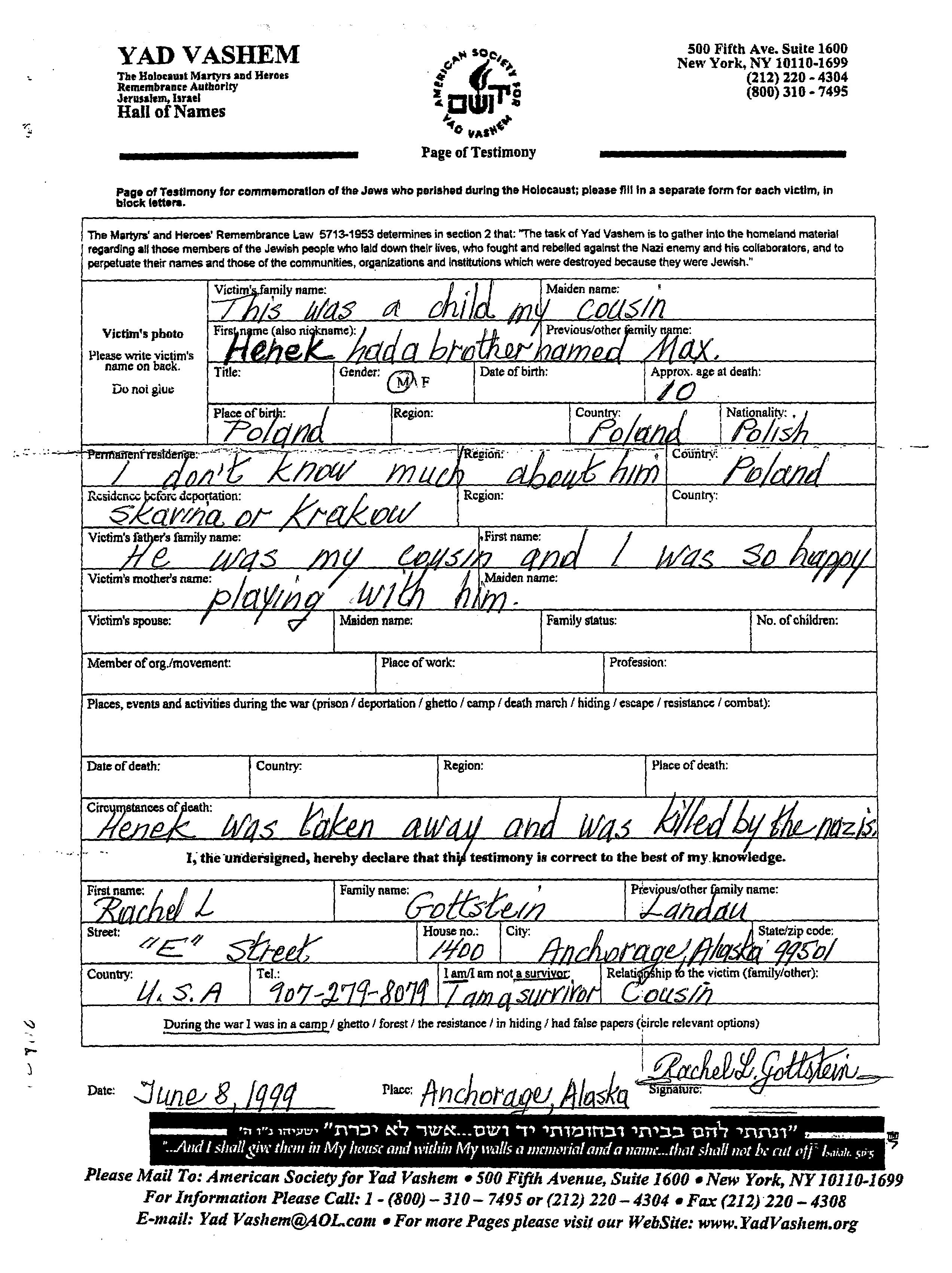 Henek Name unbekannt wurde in Polen geboren. Vor dem Zweiten Weltkrieg lebte er in Polen. Während des Krieges war er in Skawina, Polen.