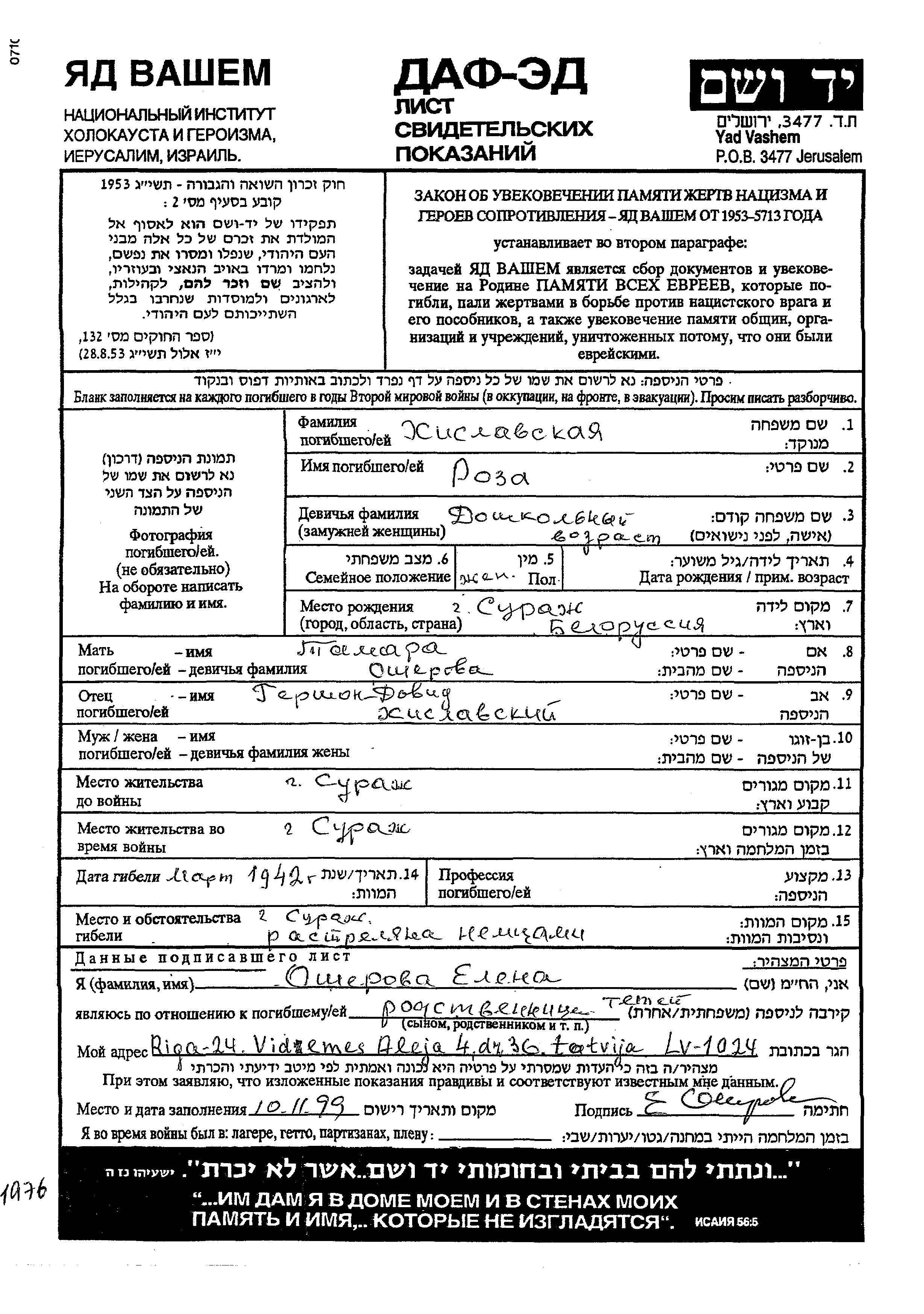 Roza Khislavski Osherova wurde in Surazh, Weißrussland (UdSSR) geboren. Sie war die Tochter von Gershon Dovid und Tamara. Sie war Kind. Vor dem Zweiten Weltkrieg lebte sie in Surazh, Weißrussland (UdSSR). Während des Krieges war sie in Surazh, Weißrussland (UdSSR).