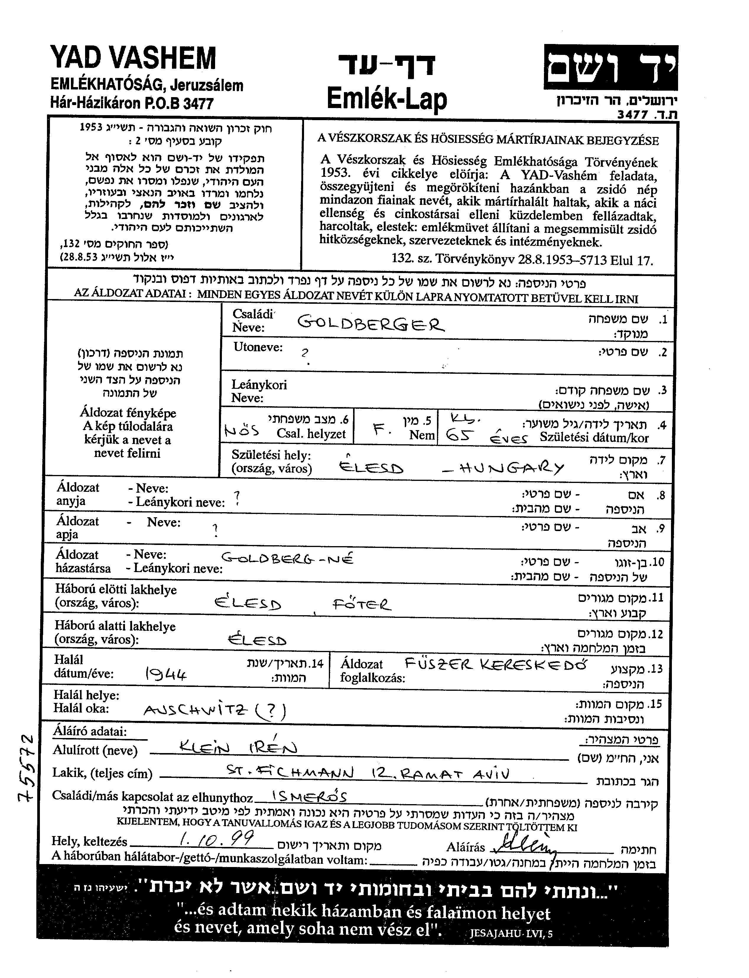 Vorname unbekannt Goldberger wurde in Elesd geboren. Sie war Gewürzhändler und Verheiratet. Vor dem Zweiten Weltkrieg lebte sie in Elesd. Während des Krieges war sie in Elesd.