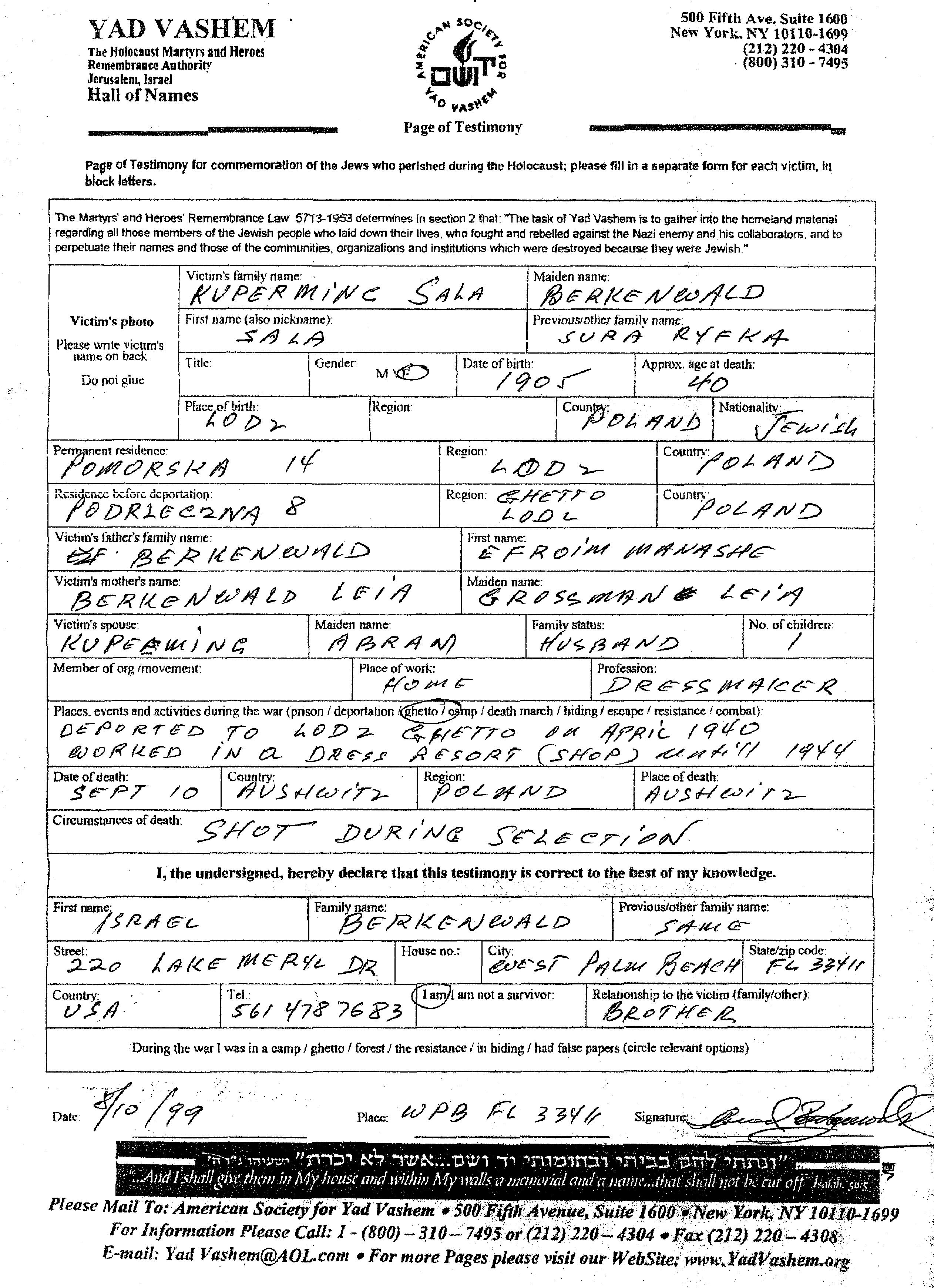 Sala Kuperminc, geb. Berkenwald wurde im Jahr 1905 in Lodz, Polen geboren. Sie war die Tochter von Efroim Menashe und Leia. Sie war Schneiderin und mit Abram Verheiratet. Vor dem Zweiten Weltkrieg lebte sie in Lodz, Polen. Während des Krieges war sie in Lodz, Polen.