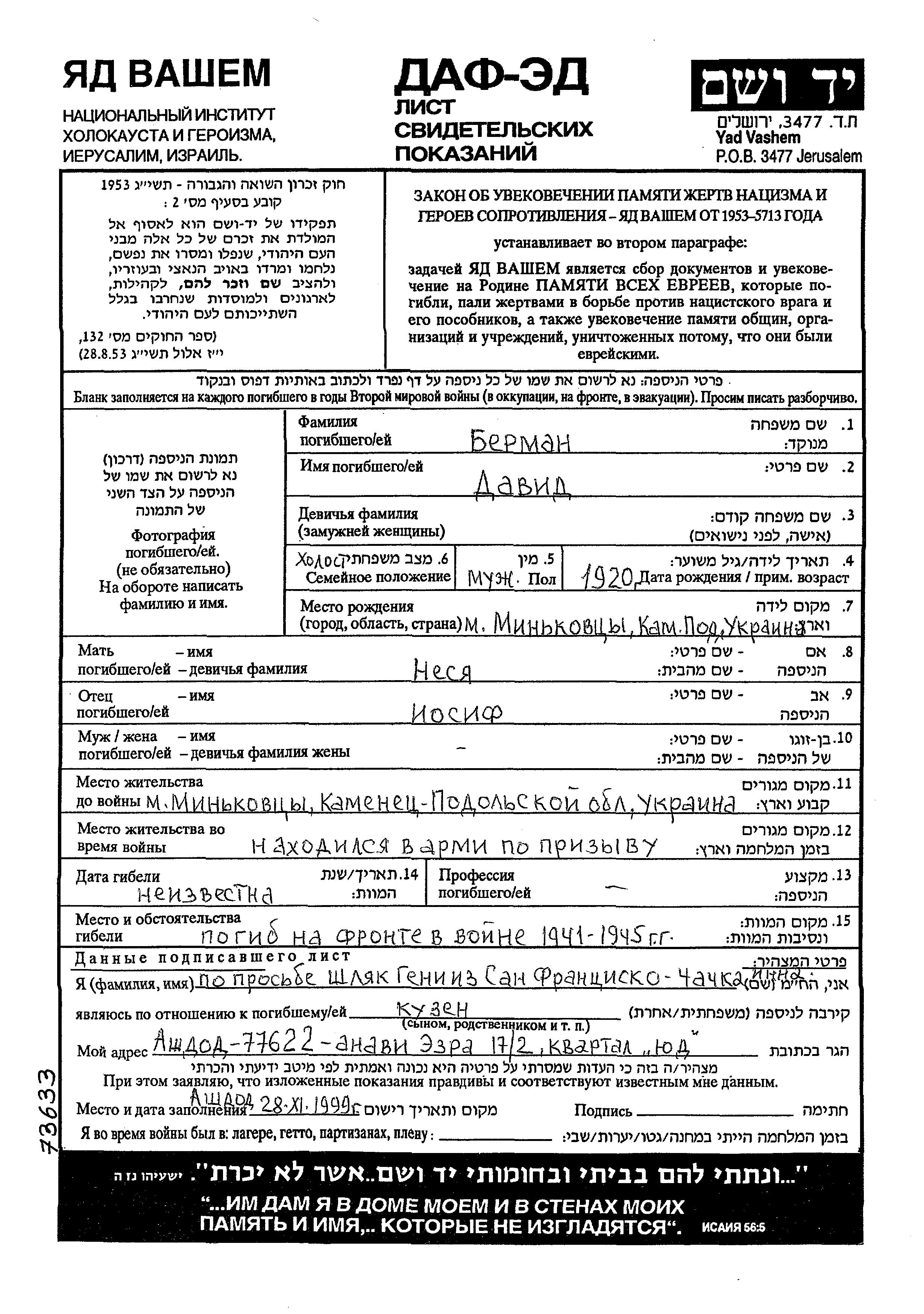 Berman David 1920 Minkovtsy, Ukraine (UdSSR) Gedenkblatt