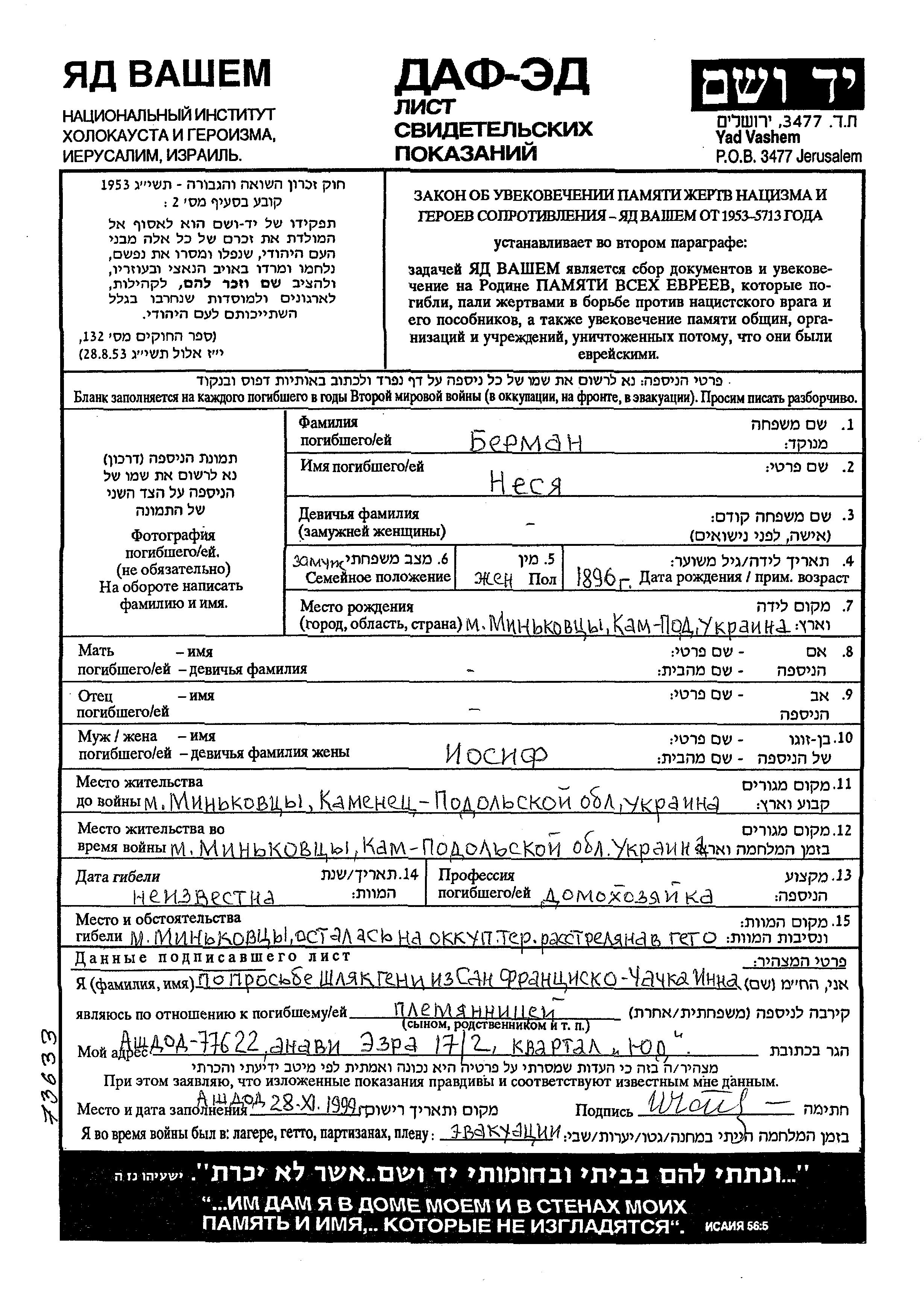 Nesya Berman wurde im Jahr 1896 in Minkovtsy, Ukraine (UdSSR) geboren. Sie war Hausfrau und mit Iosif Verheiratet. Vor dem Zweiten Weltkrieg lebte sie in Minkovtsy, Ukraine (UdSSR). Während des Krieges war sie in Minkovtsy, Ukraine (UdSSR).