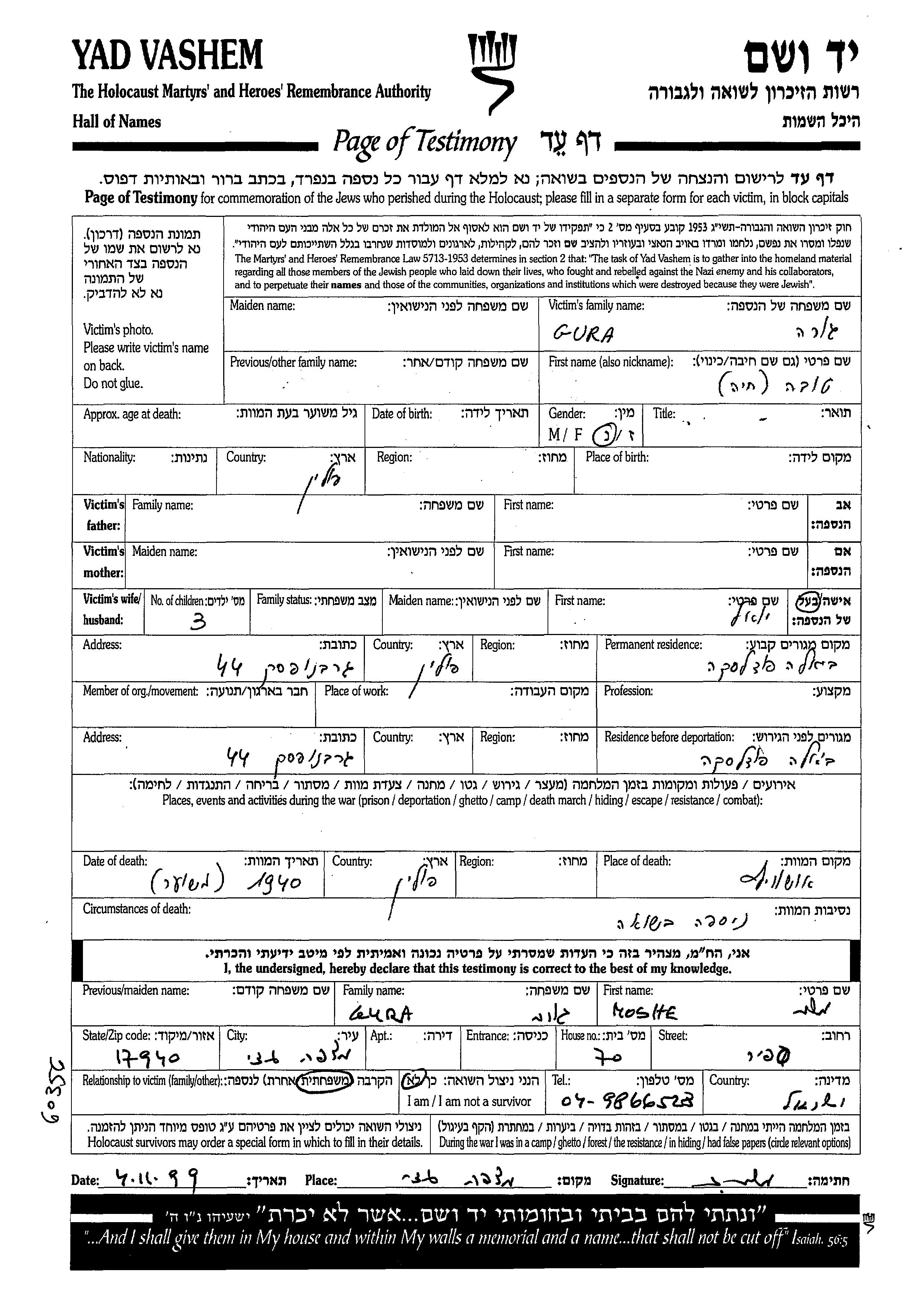 Tova Khaia Gora wurde in Polen geboren. Sie war mit Yoel Verheiratet. Vor dem Zweiten Weltkrieg lebte sie in Biala Podlaska, Polen. Während des Krieges war sie in Biala Podlaska, Polen.