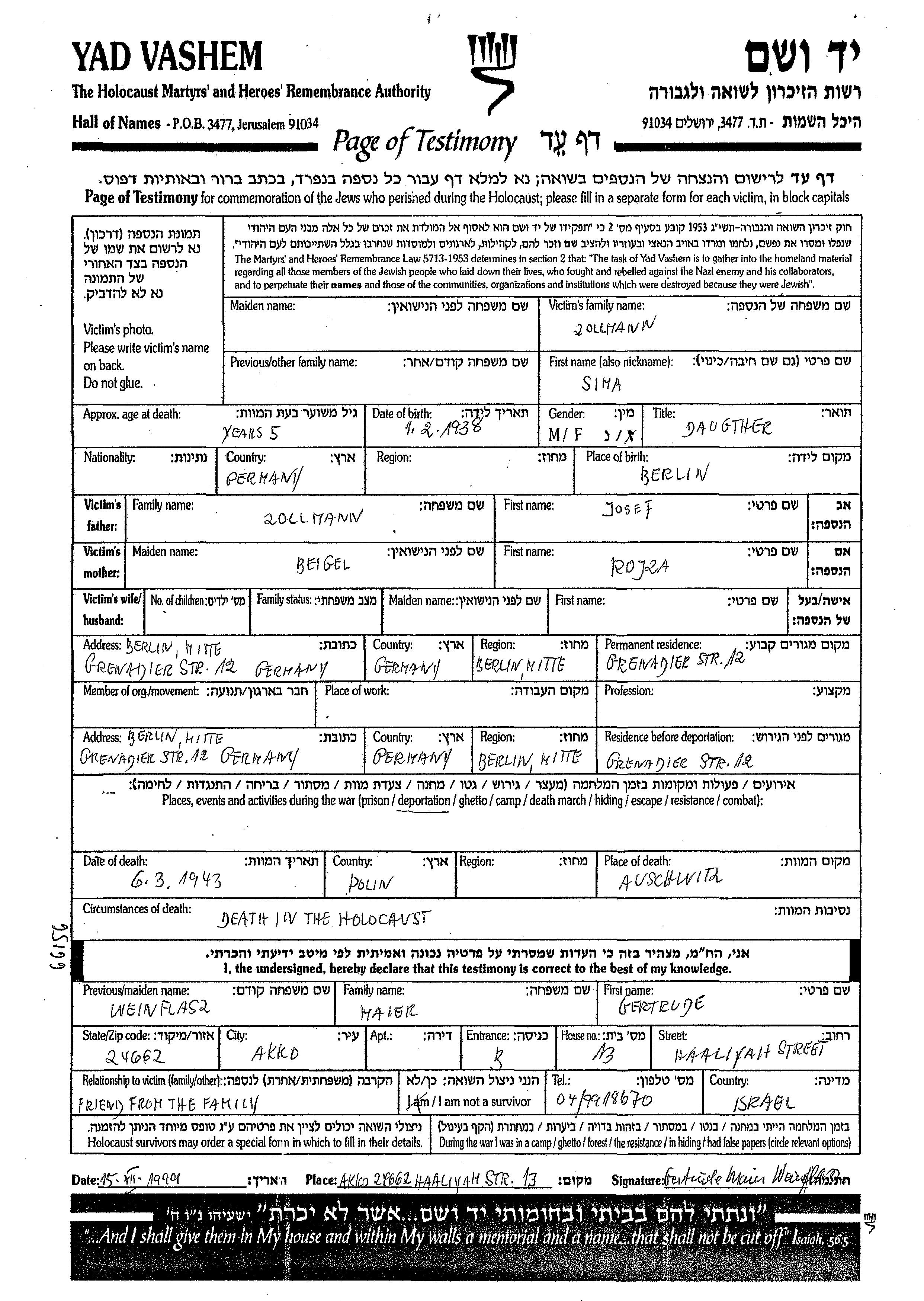 Sima wurde in der Schoah ermordet. Todesort: Auschwitz, Polen im Jahr 1943.