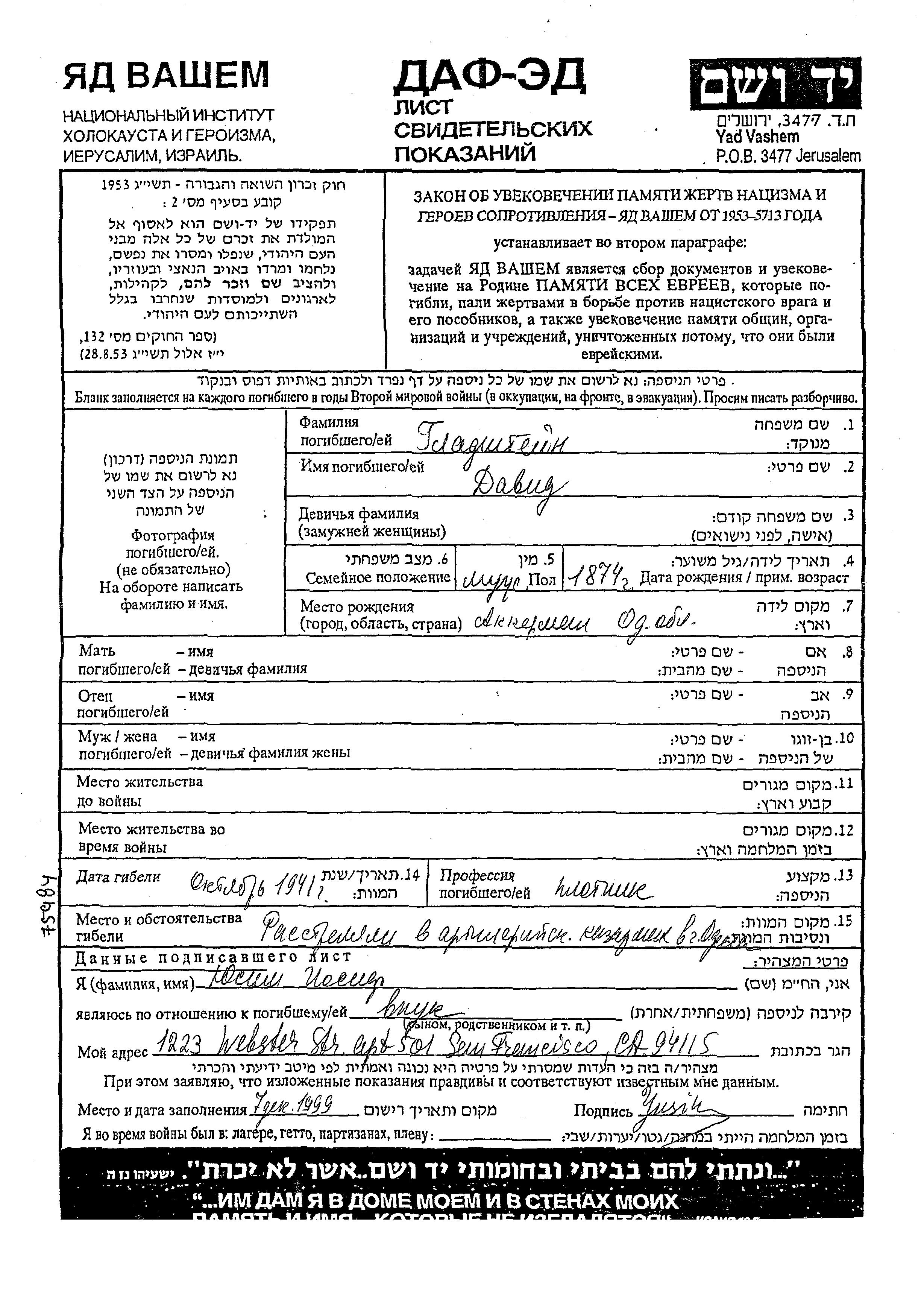 David wurde in der Schoah ermordet. Todesort: Odessa, Ukraine (UdSSR) im Jahr 1941.