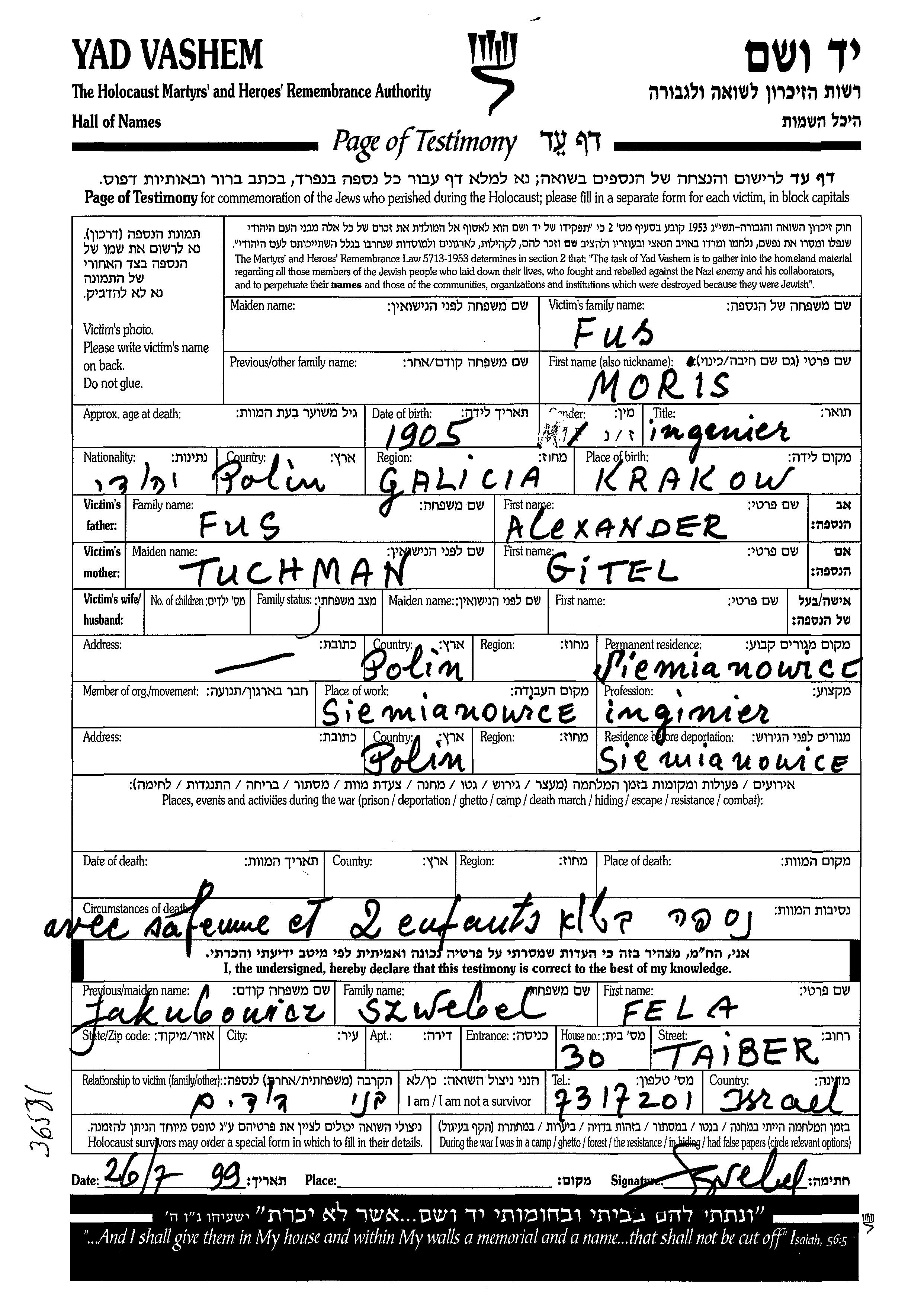 Moris Fus wurde im Jahr 1905 in Krakow, Polen geboren. Er war der Sohn von Alexander und Gitel. Er war Ingenieur und Verheiratet. Vor dem Zweiten Weltkrieg lebte er in Siemianowice, Polen. Während des Krieges war er in Siemianowice, Polen.