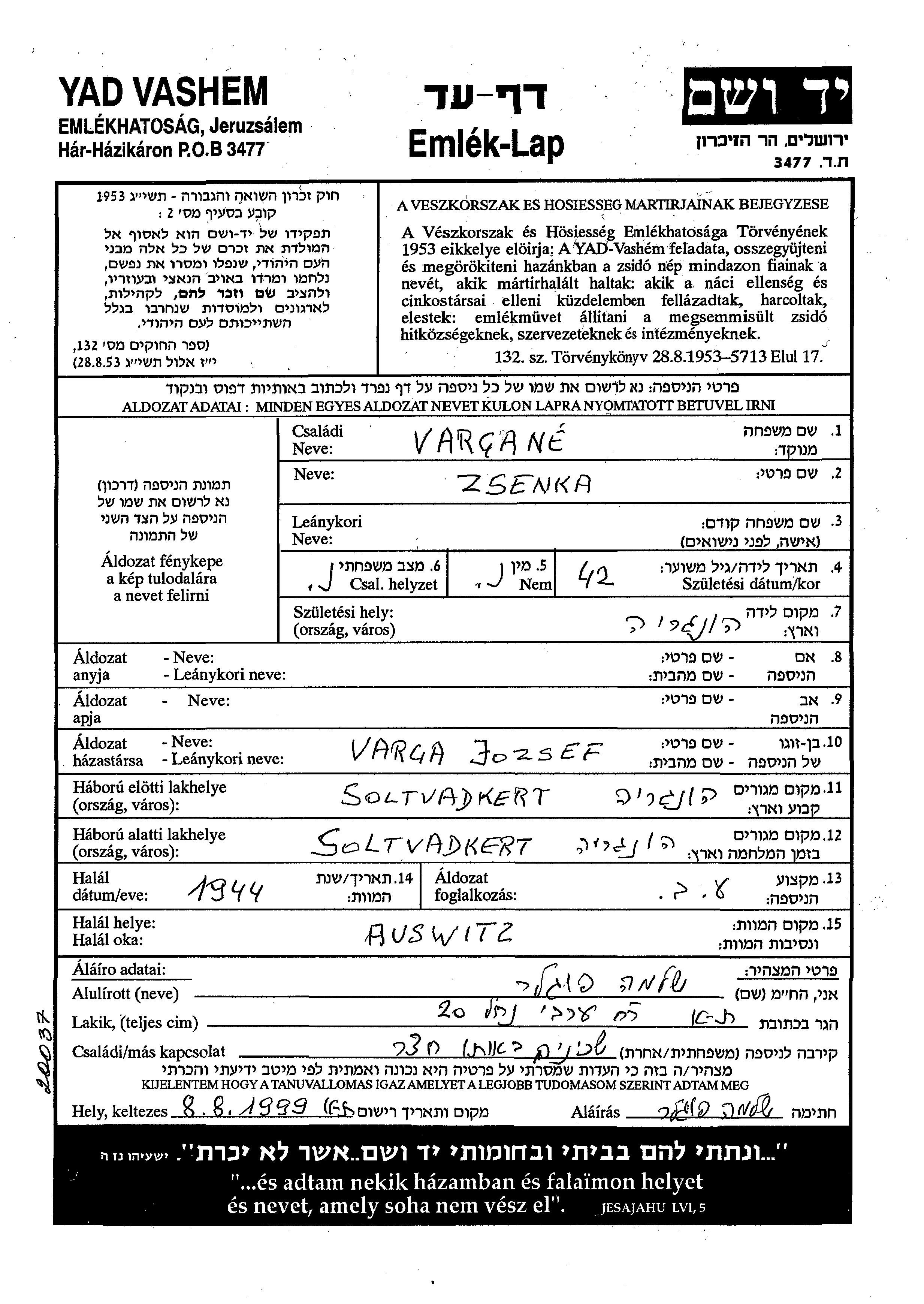 Varga Zsenka Soltvadkert, Ungarn Gedenkblatt