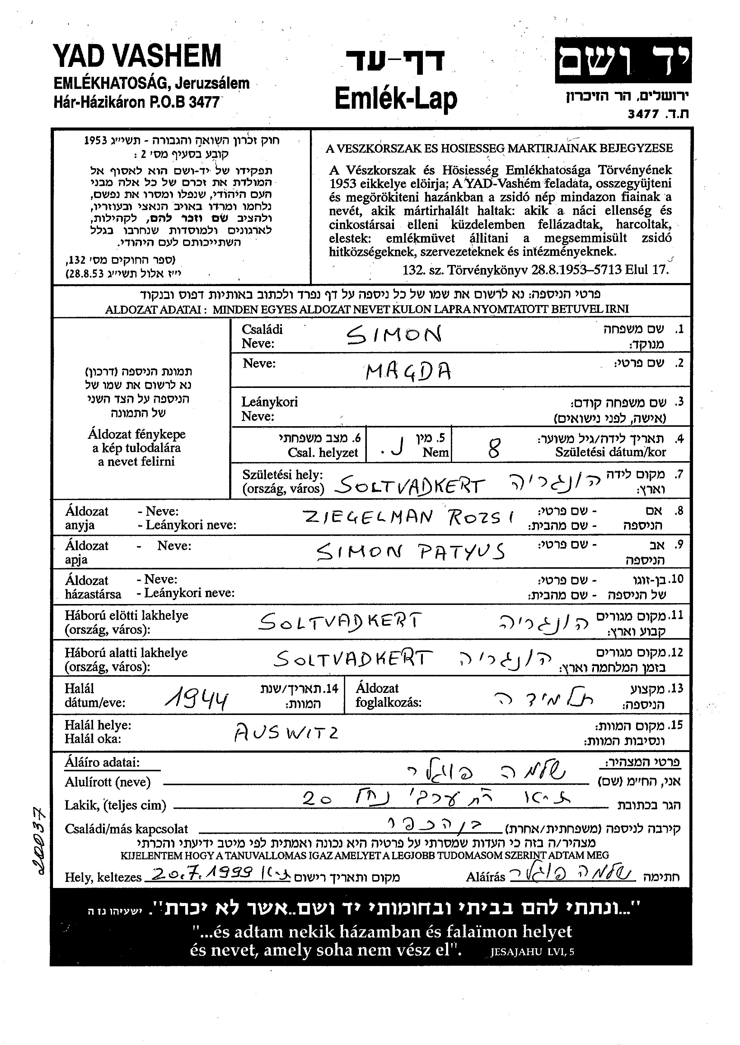 Simon Magda Soltvadkert, Ungarn Gedenkblatt