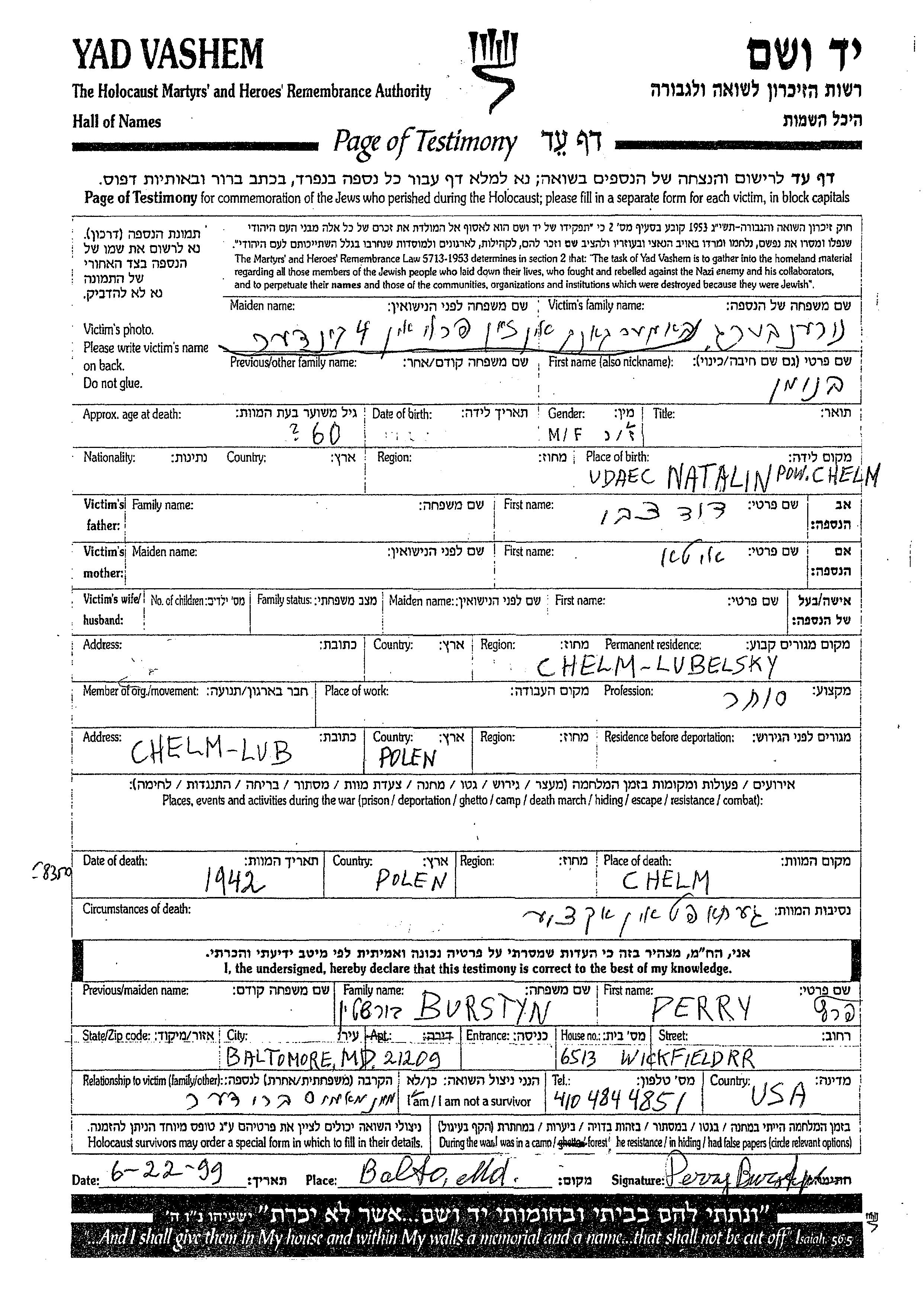 Nirnberg Beniamin Chelm, Polen Gedenkblatt
