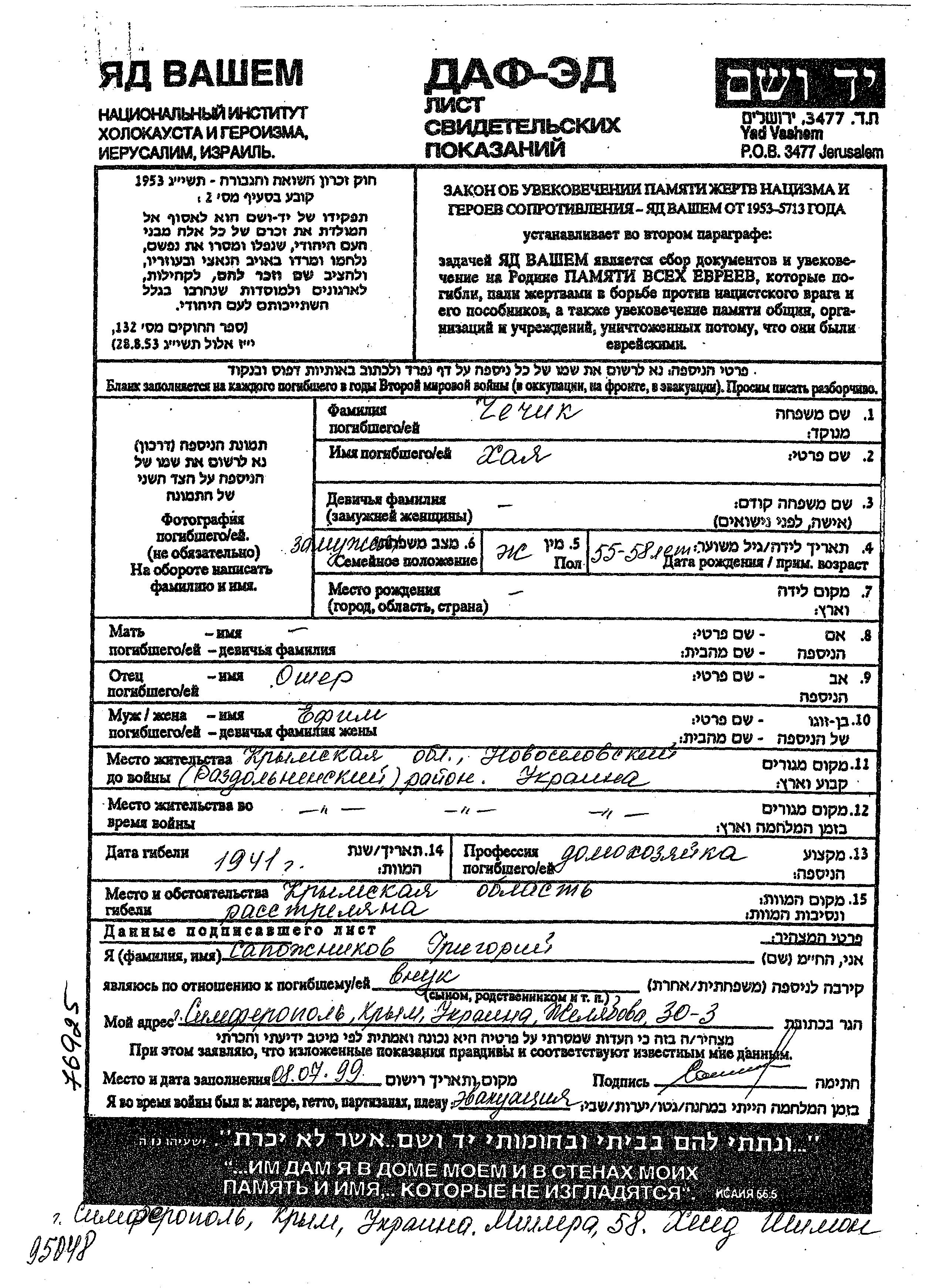 Khaia Chechik wurde Sie war die Tochter von Osher. Sie war Hausfrau und mit Yefim Verheiratet. Vor dem Zweiten Weltkrieg lebte sie in Novoselovskoye, Russland (UdSSR). Während des Krieges war sie in Novoselovskoye, Russland (UdSSR).