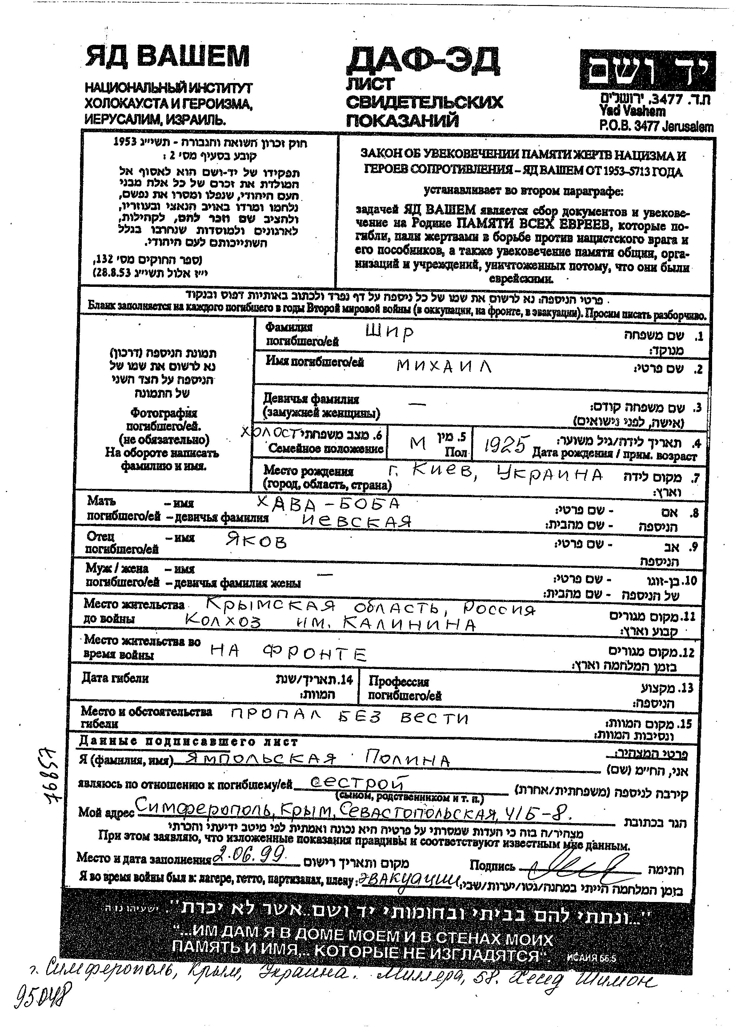 Mikhail Shir wurde im Jahr 1925 in Kiev, Ukraine (UdSSR) geboren. Er war der Sohn von Yakov und Khava Boba. Er war Ledig. Vor dem Zweiten Weltkrieg lebte er in Krym ASSR, Russland (UdSSR). Während des Krieges war er in die Sowjetischen Streitkräfte.