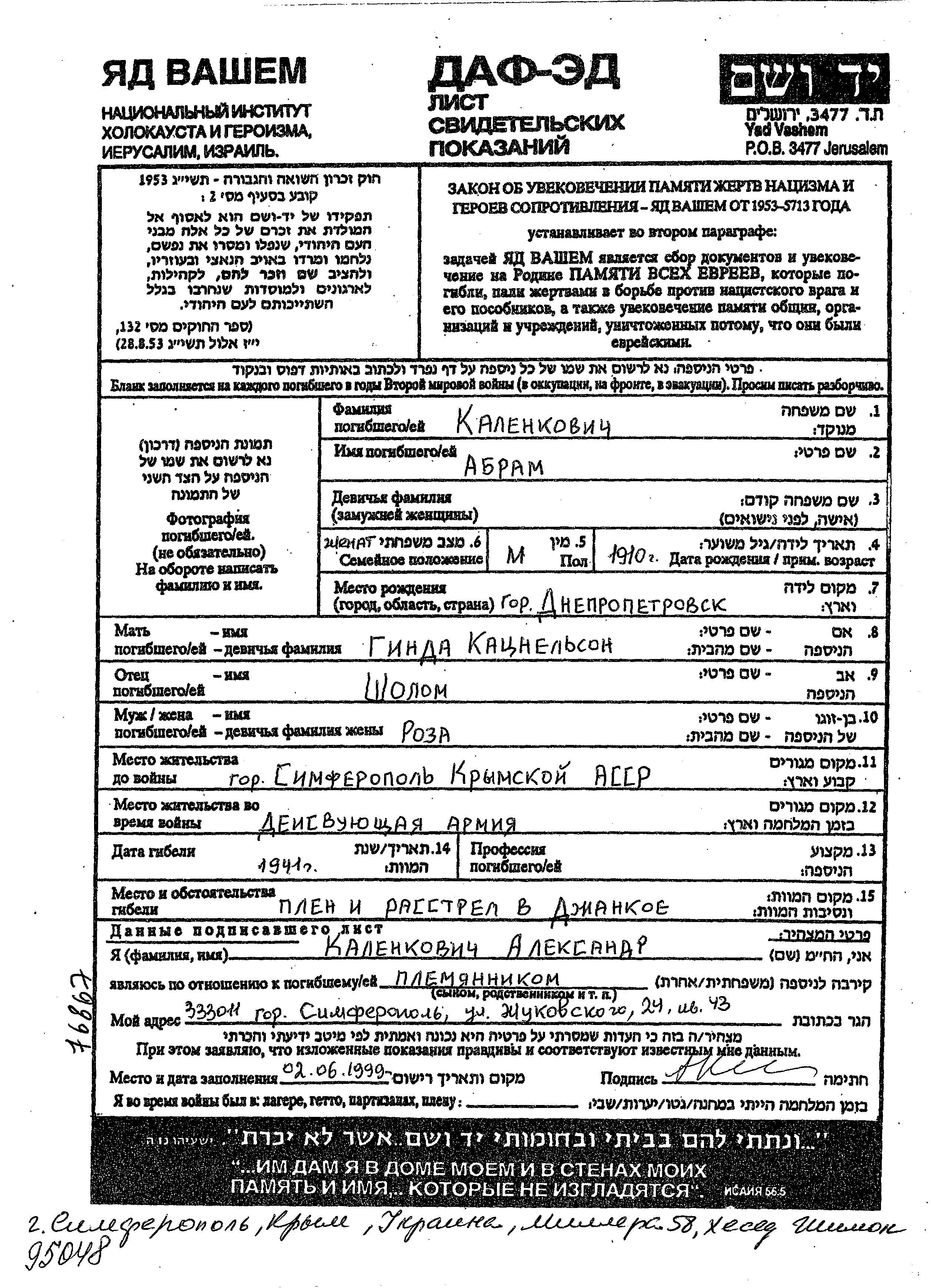 Abram Kalenkovich wurde im Jahr 1910 in Dnepropetrovsk, Ukraine (UdSSR) geboren. Er war der Sohn von Sholom und Ginda. Er war mit Roza Verheiratet. Vor dem Zweiten Weltkrieg lebte er in Simferopol, Russland (UdSSR). Während des Krieges war er in die Sowjetischen Streitkräfte.