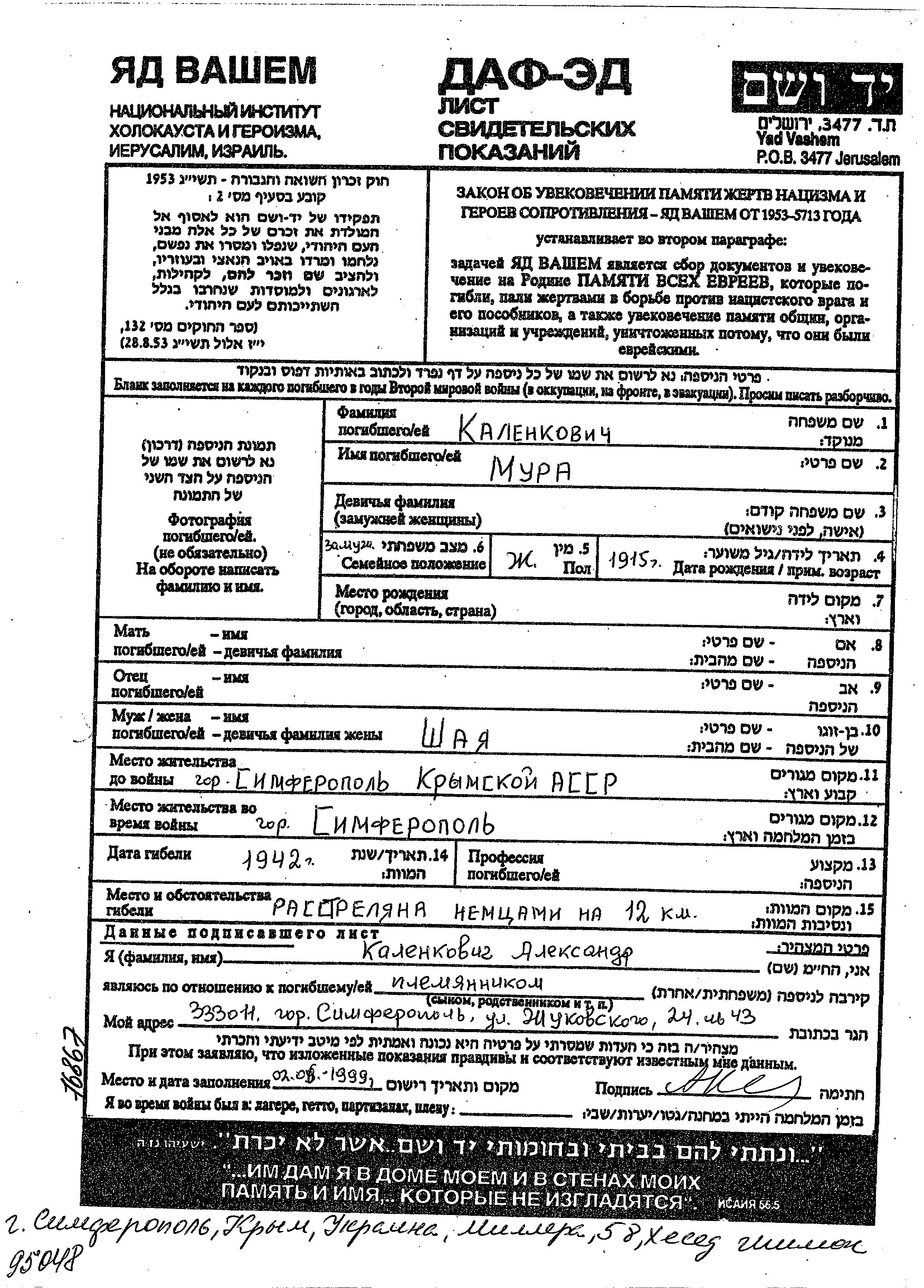 Mura Kalenkovich wurde im Jahr 1915 geboren. Sie war mit Shaya Verheiratet. Vor dem Zweiten Weltkrieg lebte sie in Simferopol, Russland (UdSSR). Während des Krieges war sie in Simferopol, Russland (UdSSR).