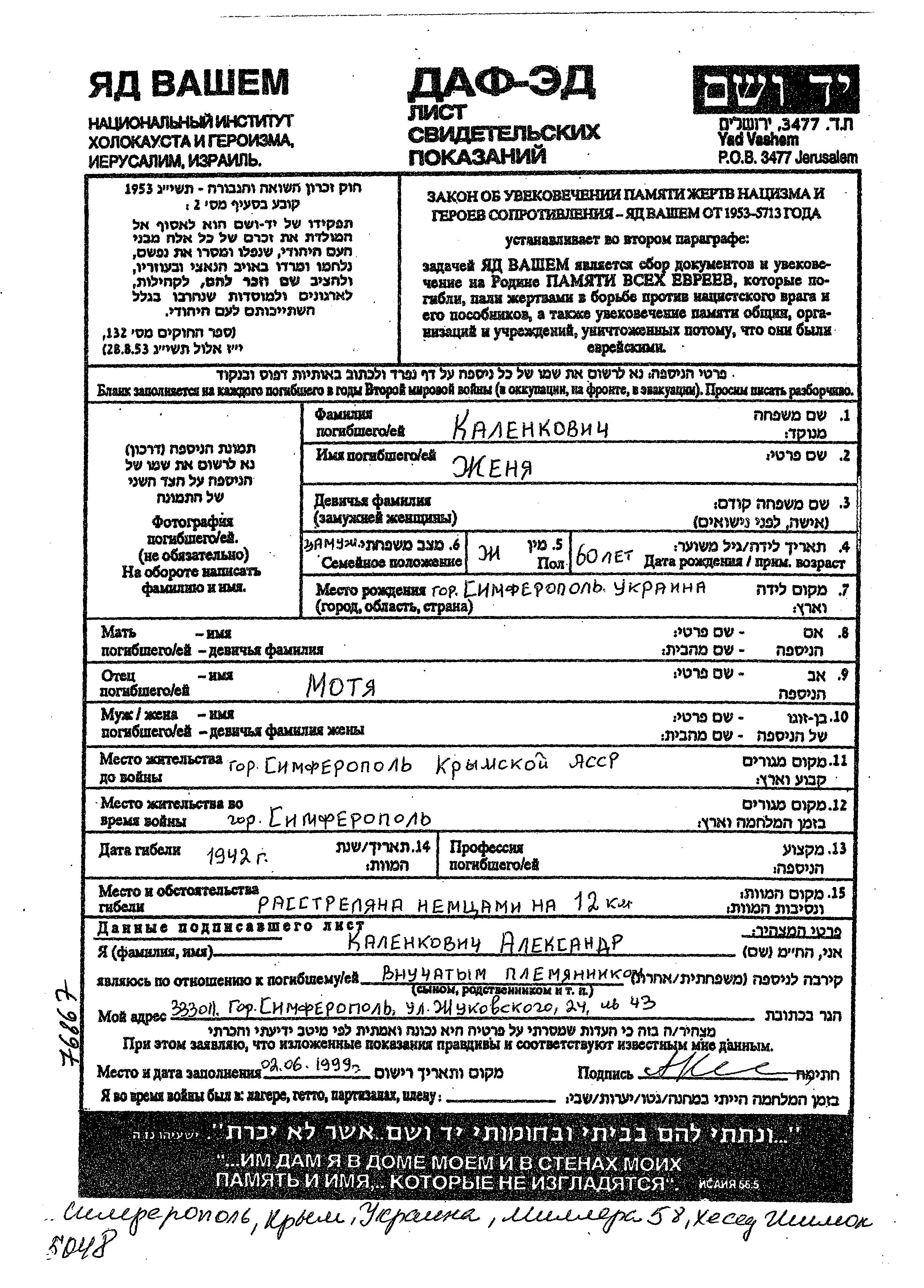 Zhenya wurde in der Schoah ermordet. Todesort: Simferopol, Russland (UdSSR) im Jahr 1942.