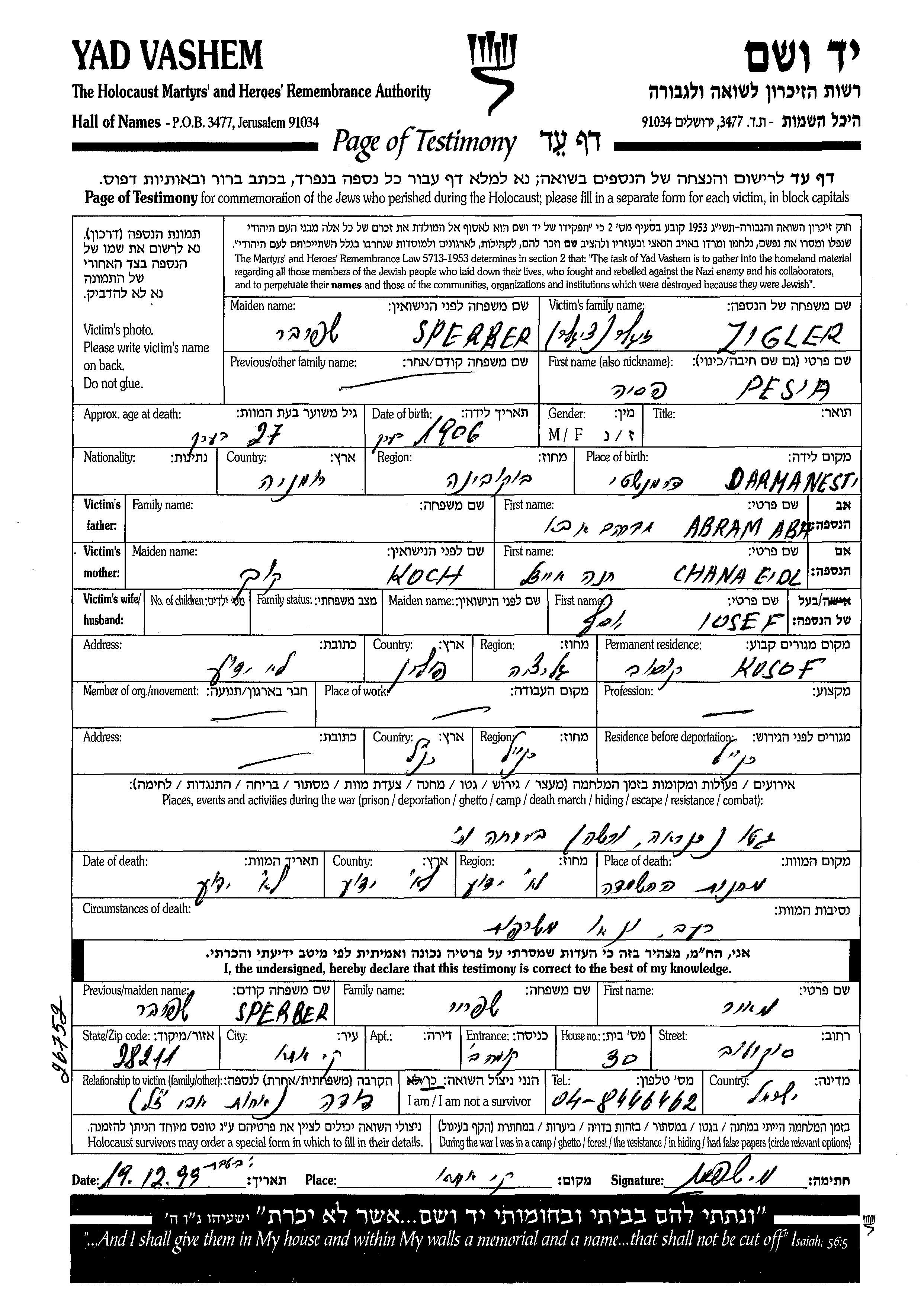 Pesia Zigler, geb. Sperber wurde im Jahr 1906 in Darmanesti, Rumänien geboren. Sie war die Tochter von Abram Aba und Chana Eidl. Vor dem Zweiten Weltkrieg lebte sie in Kosow Pokucki, Polen. Während des Krieges war sie in Kosow Pokucki, Polen.
