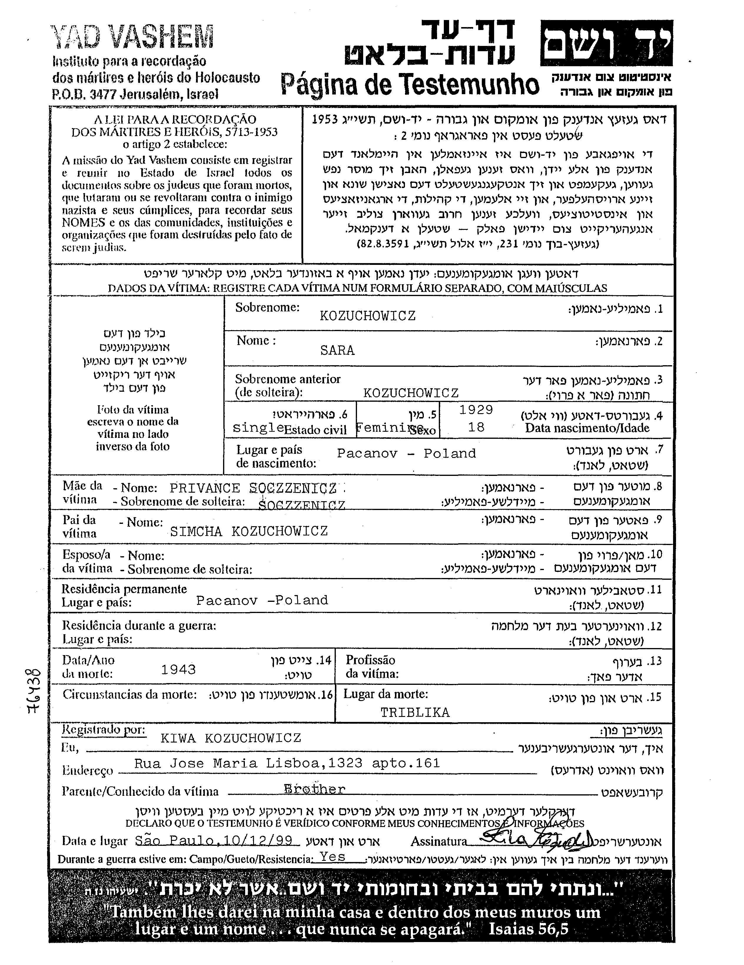 Kozuchowicz Sara 1929 Pacanow, Polen Gedenkblatt