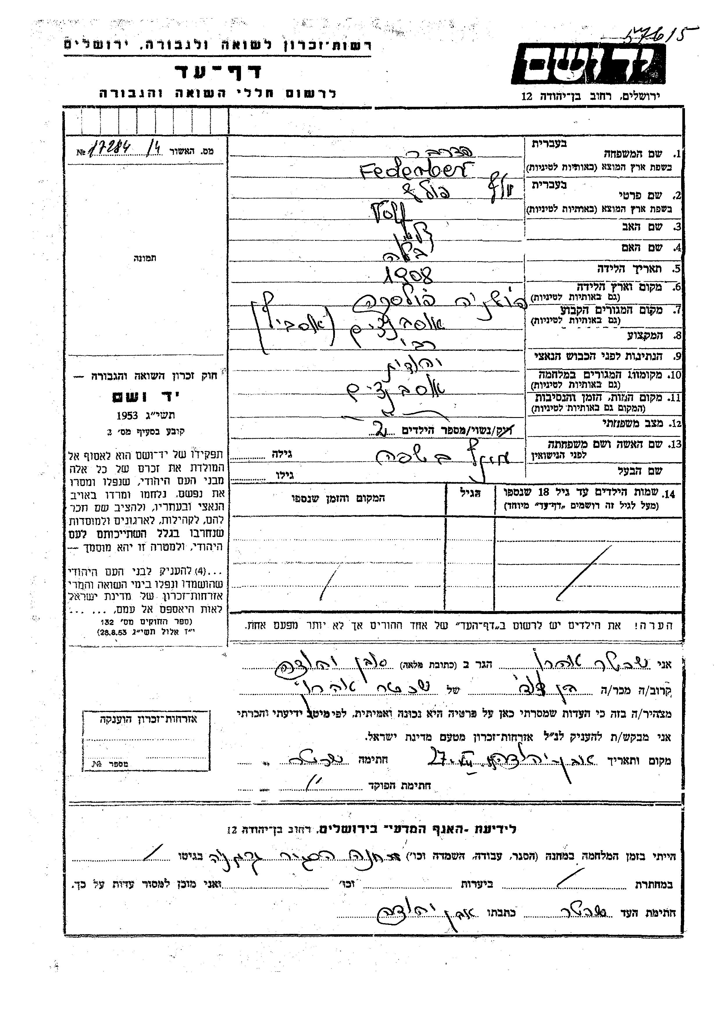 Volf Federber Ferderber wurde im Jahr 1908 in Polen geboren. Er war der Sohn von Kalman und Bela. Er war Rabbiner und mit Batsheva, geb. Mintz Verheiratet. Vor dem Zweiten Weltkrieg lebte er in Oświęcim, Polen. Während des Krieges war er in Oświęcim, Polen.