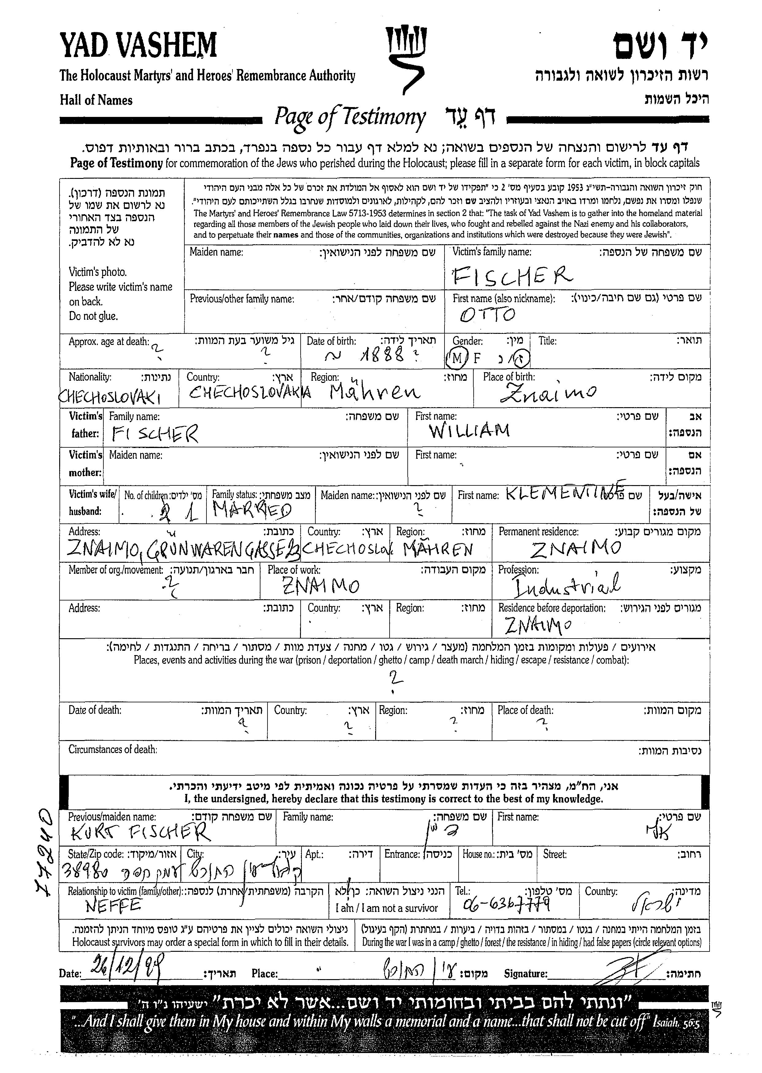 Otto Fischer wurde im Jahr 1888 in Znojmo, Tschechoslowakei geboren. Er war der Sohn von Viliam. Er war Industrielle/-r und Verheiratet. Vor dem Zweiten Weltkrieg lebte er in Znojmo, Tschechoslowakei. Während des Krieges war er in Znojmo, Tschechoslowakei.