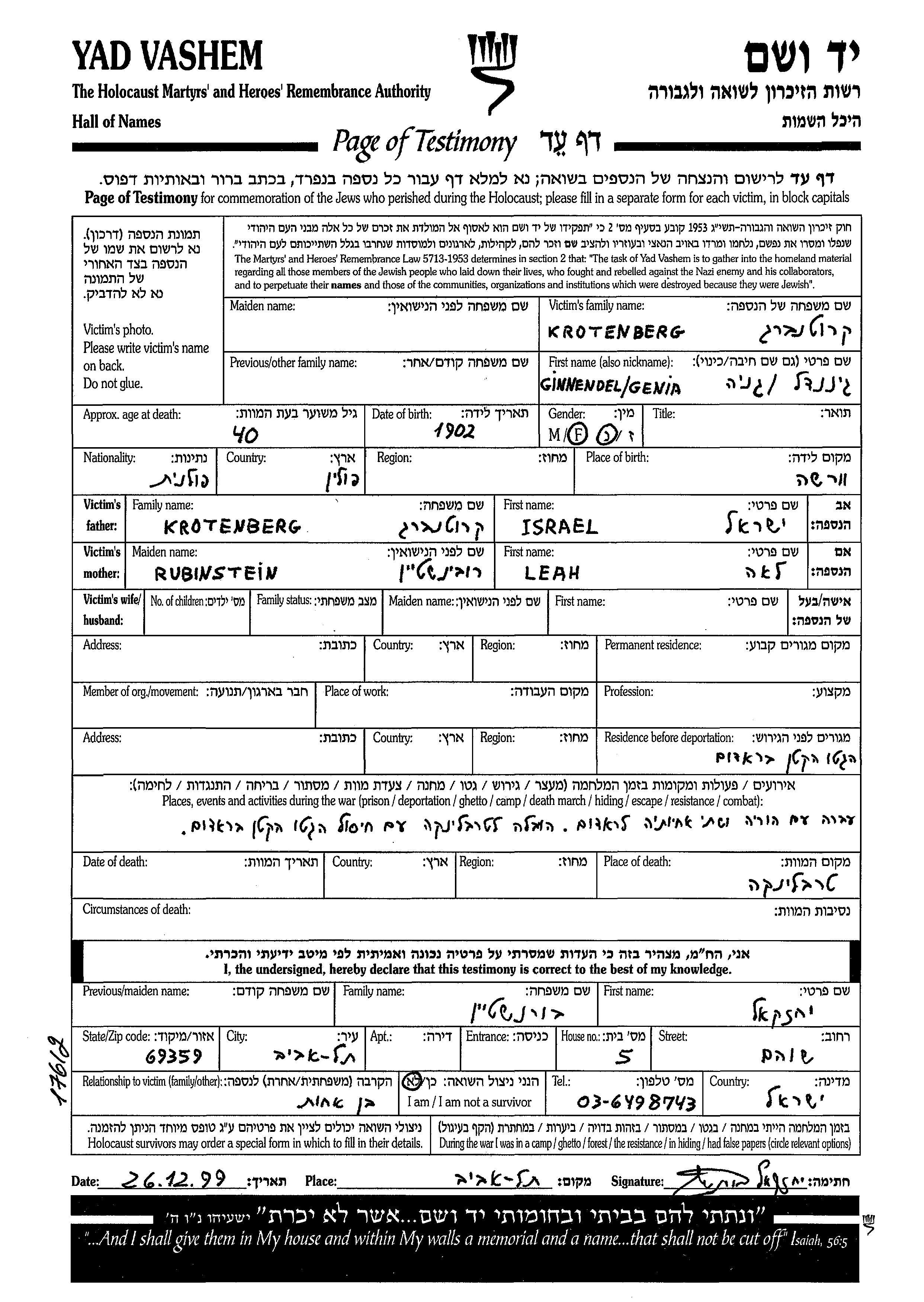 Ginnendel Genia Ginendel Krotenberg wurde im Jahr 1902 in Varsha, Polen geboren. Sie war die Tochter von Israel und Leah. Während des Krieges war sie in Radom, Polen.