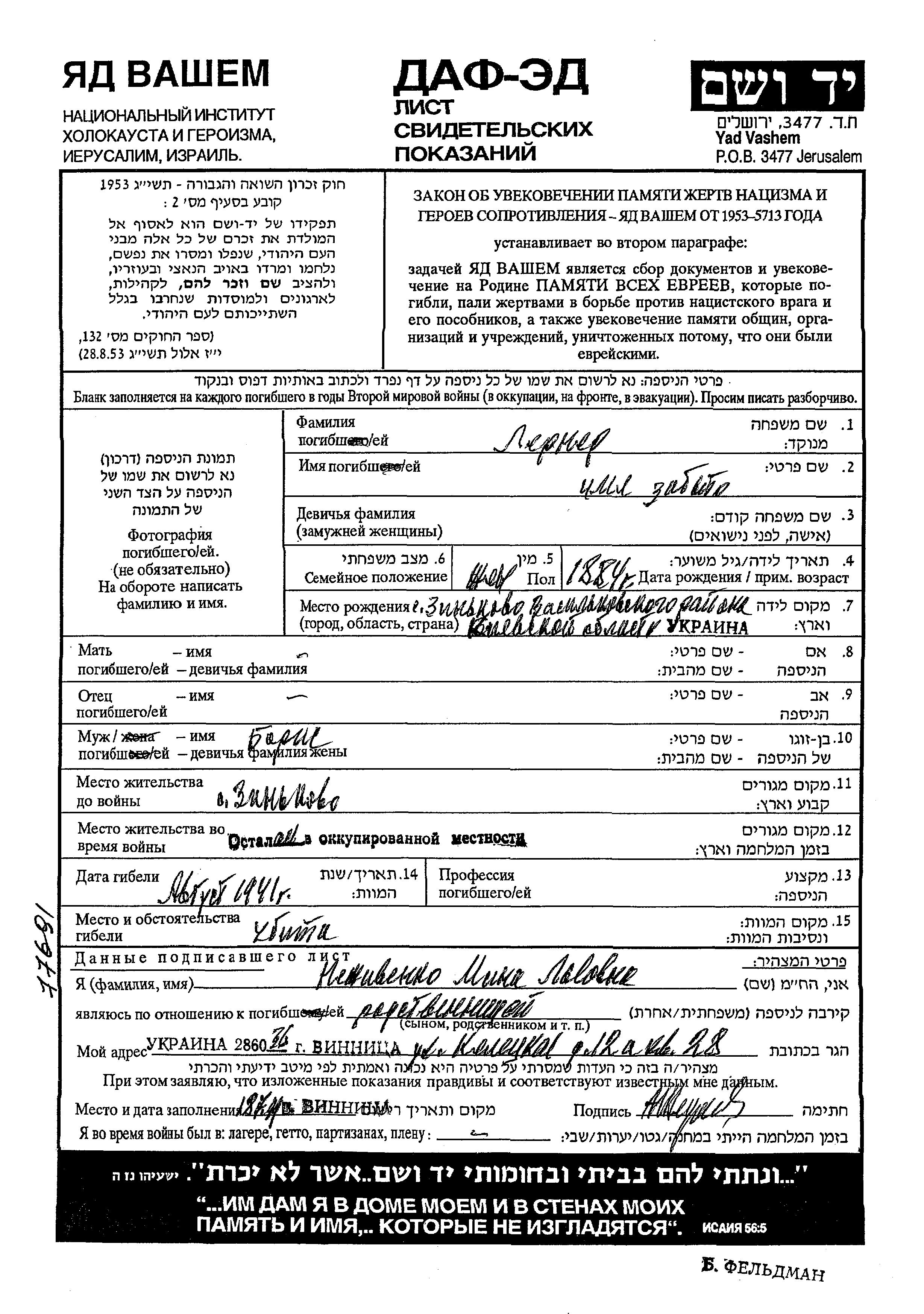 Vorname unbekannt Lerner wurde im Jahr 1884 in Zinkovo, Ukraine (UdSSR) geboren. Vor dem Zweiten Weltkrieg lebte sie in Zinkovo, Ukraine (UdSSR). Während des Krieges war sie in Zinkovo, Ukraine (UdSSR).