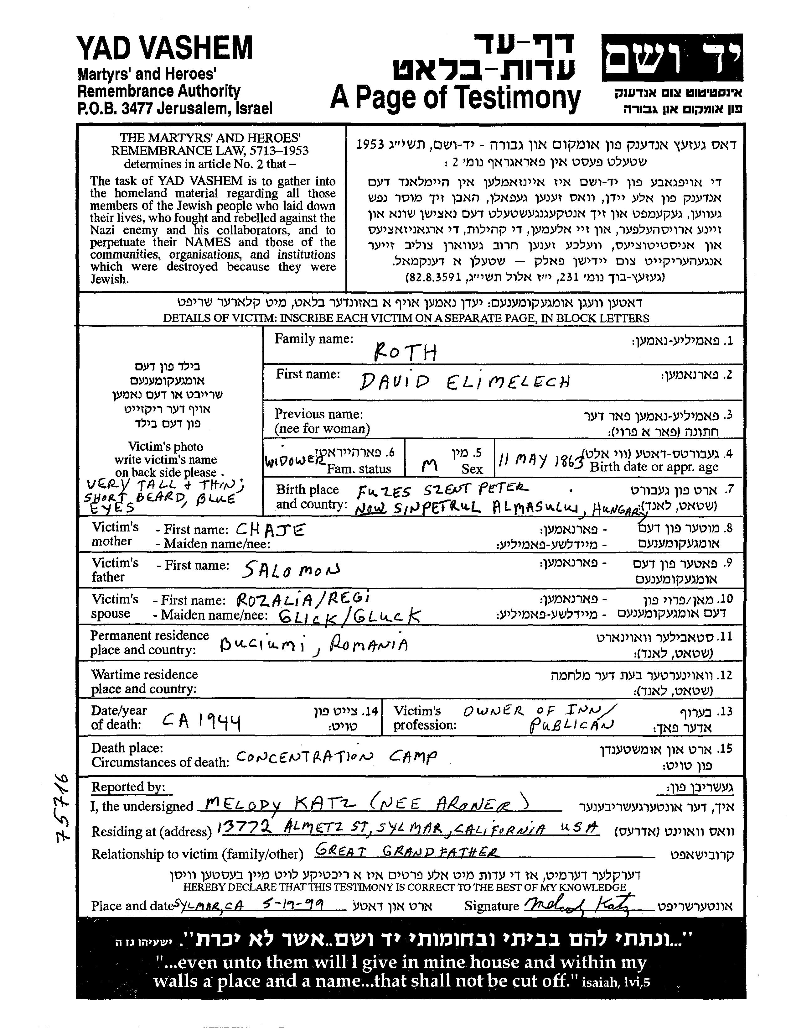 David Elimelech Roth wurde im Jahr 1863 in Fuzesszentpeter, Rumänien geboren. Er war der Sohn von Salomon und Chaje. Er war Inn owner und mit Rozalia Regi, geb. Gluck Witwer. Vor dem Zweiten Weltkrieg lebte er in Buciumi, Rumänien.