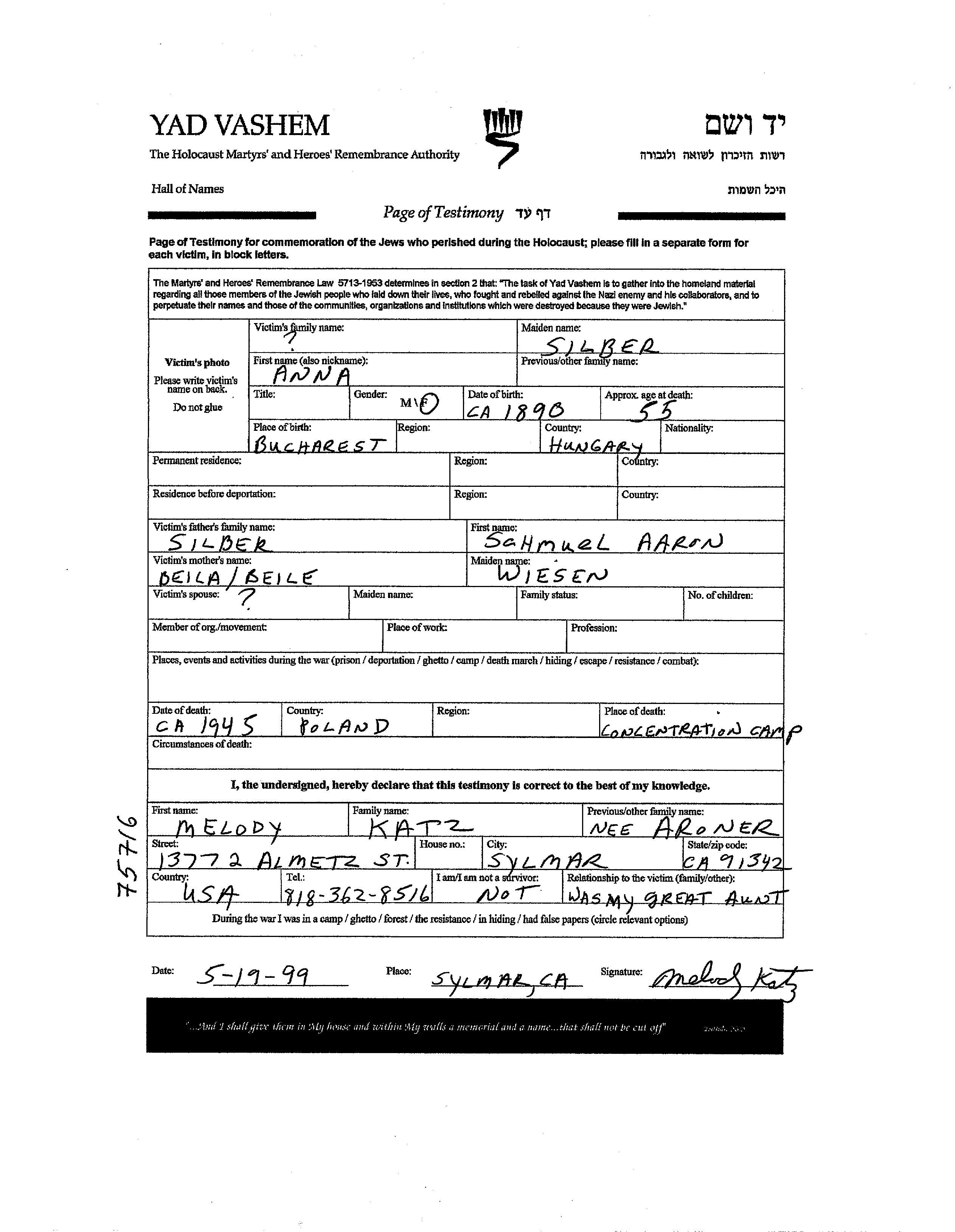 Anna Name unbekannt, geb. Silber wurde im Jahr 1890 in Bucharest, Rumänien geboren. Sie war die Tochter von Schmuel Aaron und Beila.