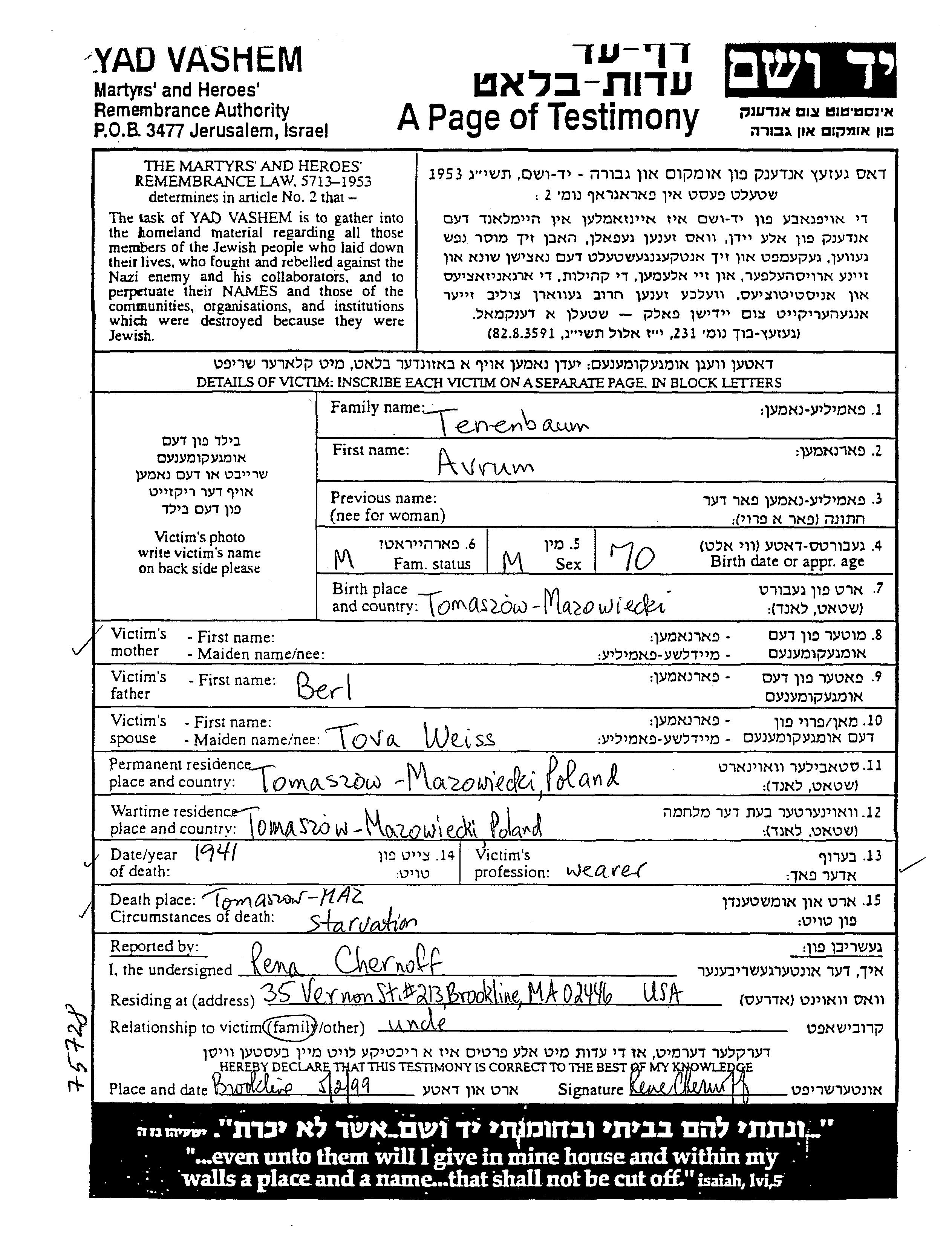 Avrum Tenebaum wurde in Tomaszow Mazowiecki, Polen geboren. Er war der Sohn von Berl. Er war Weber/-in und mit Tova, geb. Weiss Verheiratet. Vor dem Zweiten Weltkrieg lebte er in Tomaszow Mazowiecki, Polen. Während des Krieges war er in Tomaszow Mazowiecki, Polen.