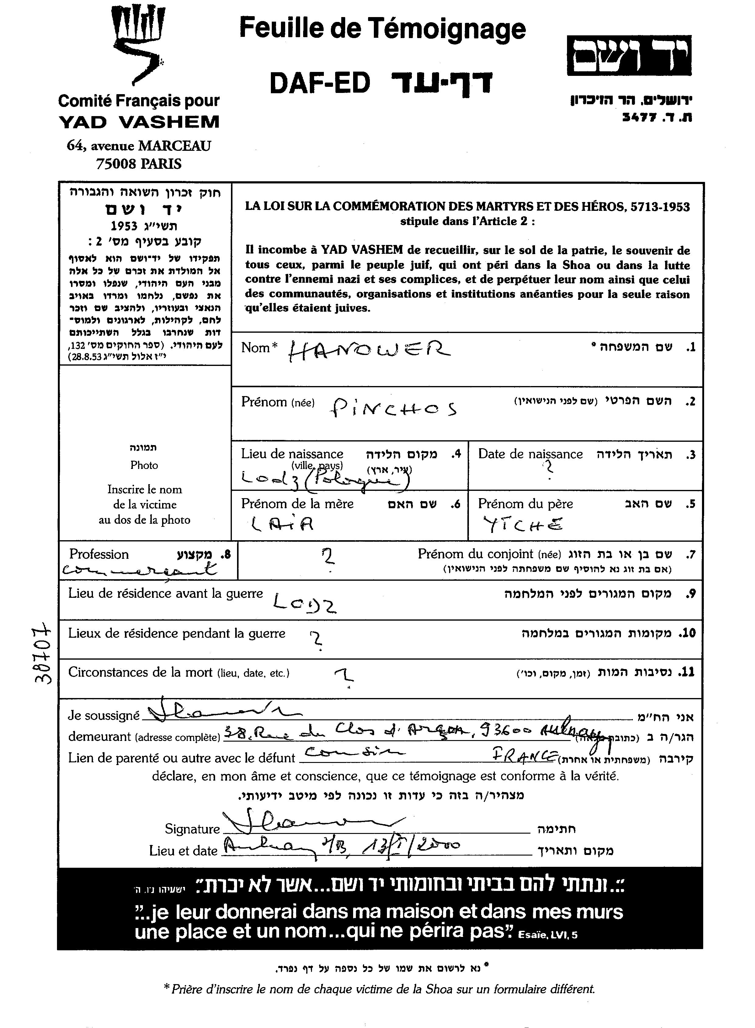 Pinchos Hanower wurde in Lodz, Polen geboren. Er war der Sohn von Ytche und Laia. Er war Kaufmann/-frau. Vor dem Zweiten Weltkrieg lebte er in Lodz, Polen.