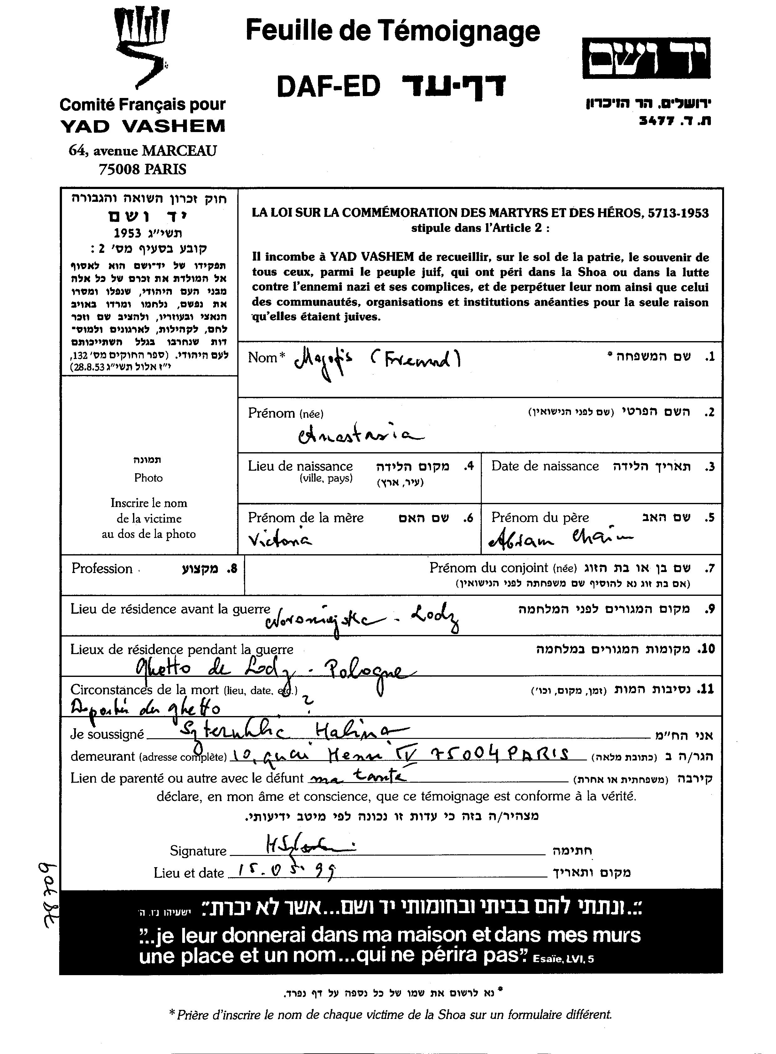 Anastasia Majofis, geb. Freund wurde Sie war die Tochter von Victoria und Abraham Chaim. Vor dem Zweiten Weltkrieg lebte sie in Lodz, Polen. Während des Krieges war sie in Lodz, Polen.