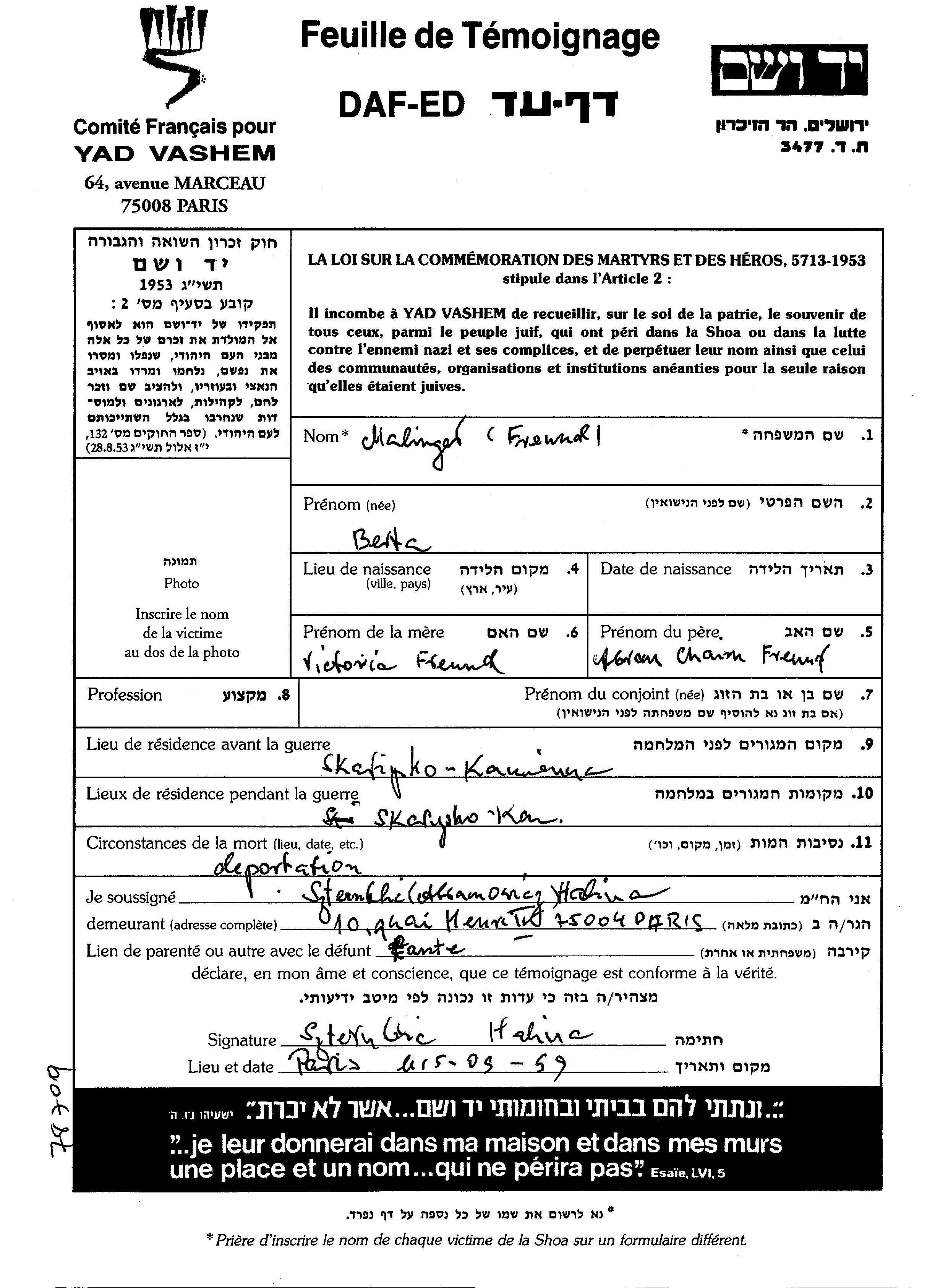 Berta Malinger, geb. Freund wurde Sie war die Tochter von Abram Chaim und Victoria. Vor dem Zweiten Weltkrieg lebte sie in Skarzysko Kamienna, Polen. Während des Krieges war sie in Skarzysko Kamienna, Polen.