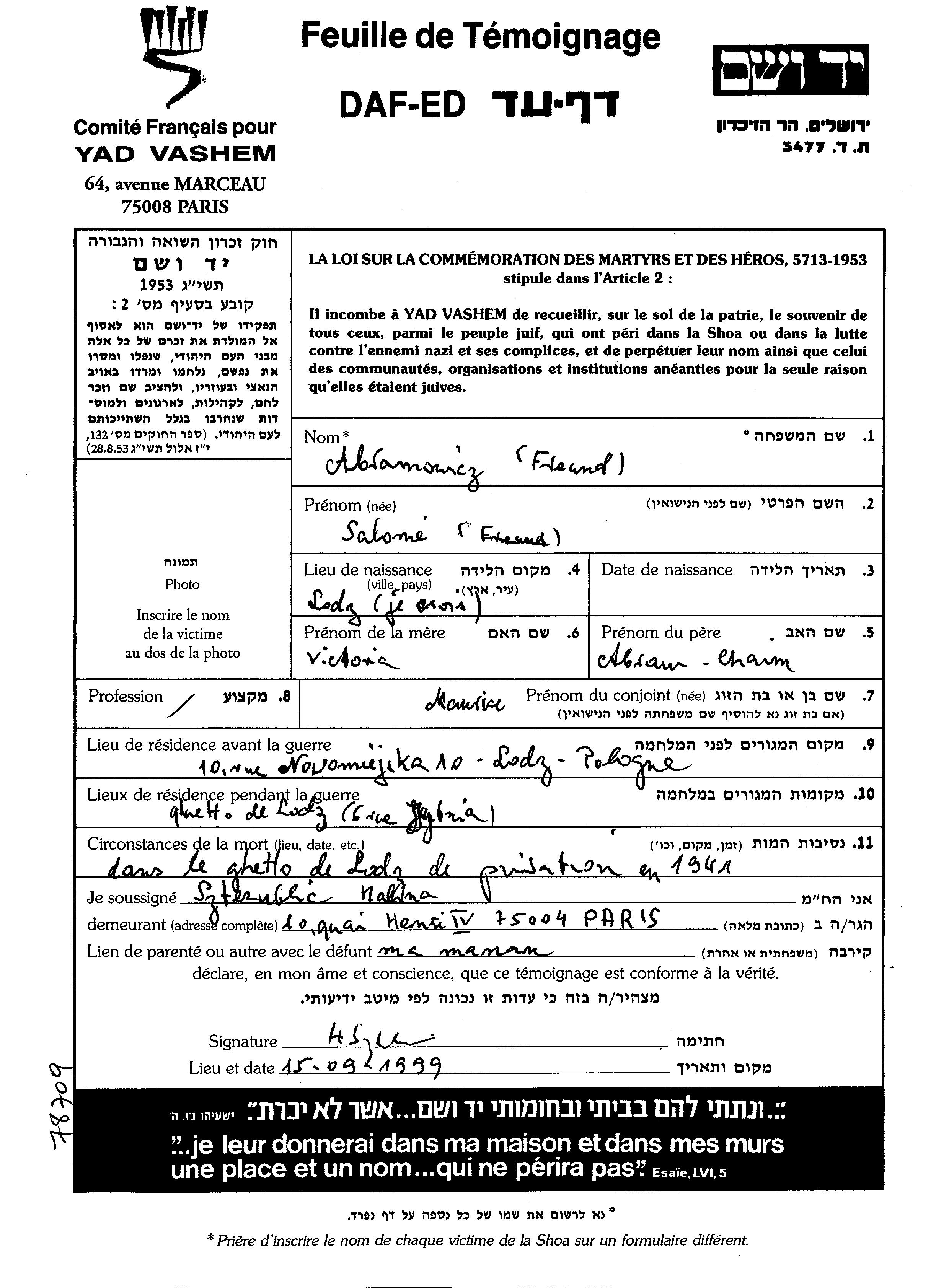 Salome Abramowicz, geb. Freund wurde in Lodz, Polen geboren. Sie war die Tochter von Abram Chaim und Victoria. Sie war mit Maurice Verheiratet. Vor dem Zweiten Weltkrieg lebte sie in Lodz, Polen. Während des Krieges war sie in Lodz, Polen.