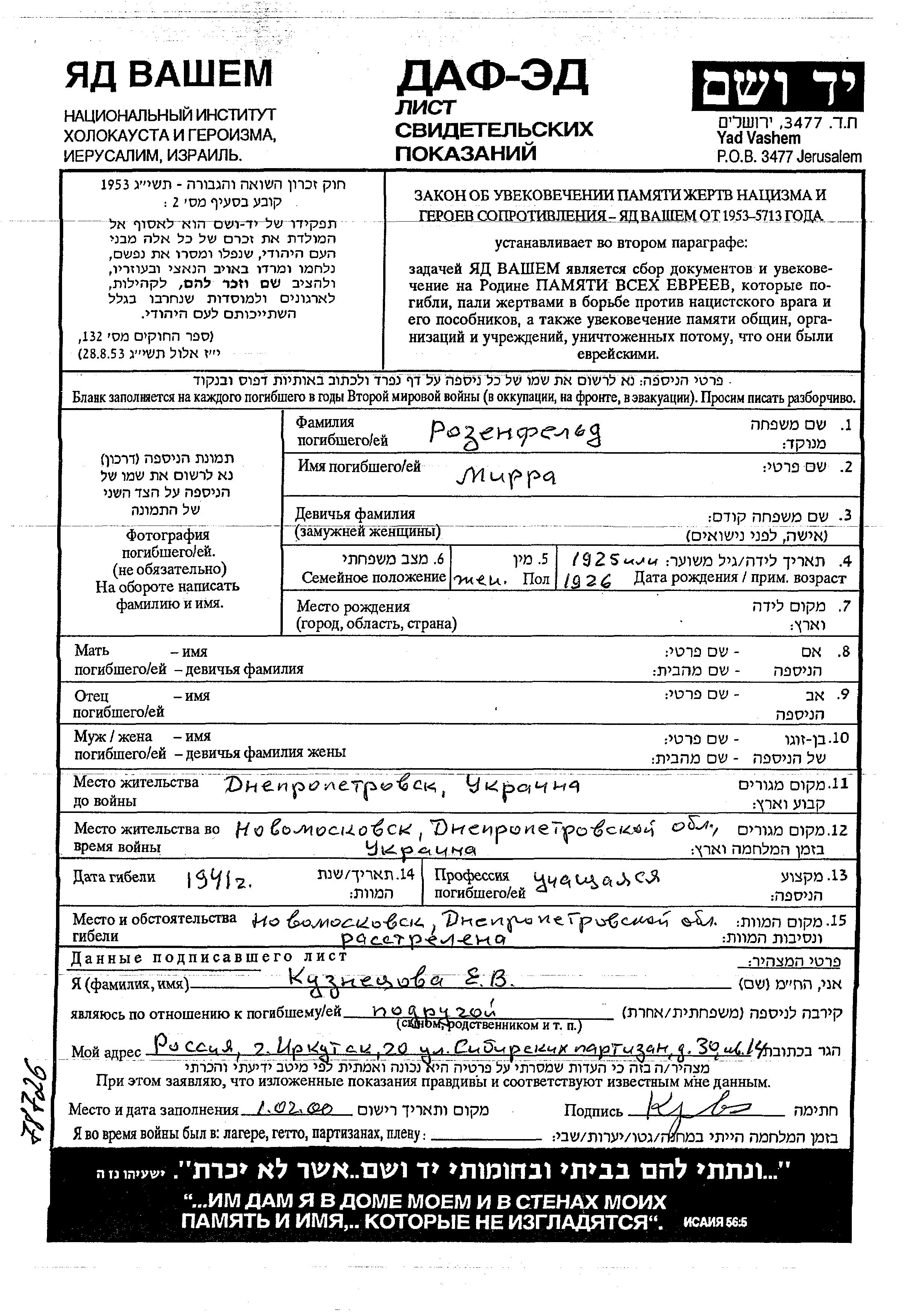 Mirra Rozenfeld wurde im Jahr 1925 geboren. Sie war Schüler/-in und Kind. Vor dem Zweiten Weltkrieg lebte sie in Dnepropetrovsk, Ukraine (UdSSR). Während des Krieges war sie in Novomoskovsk, Ukraine (UdSSR).