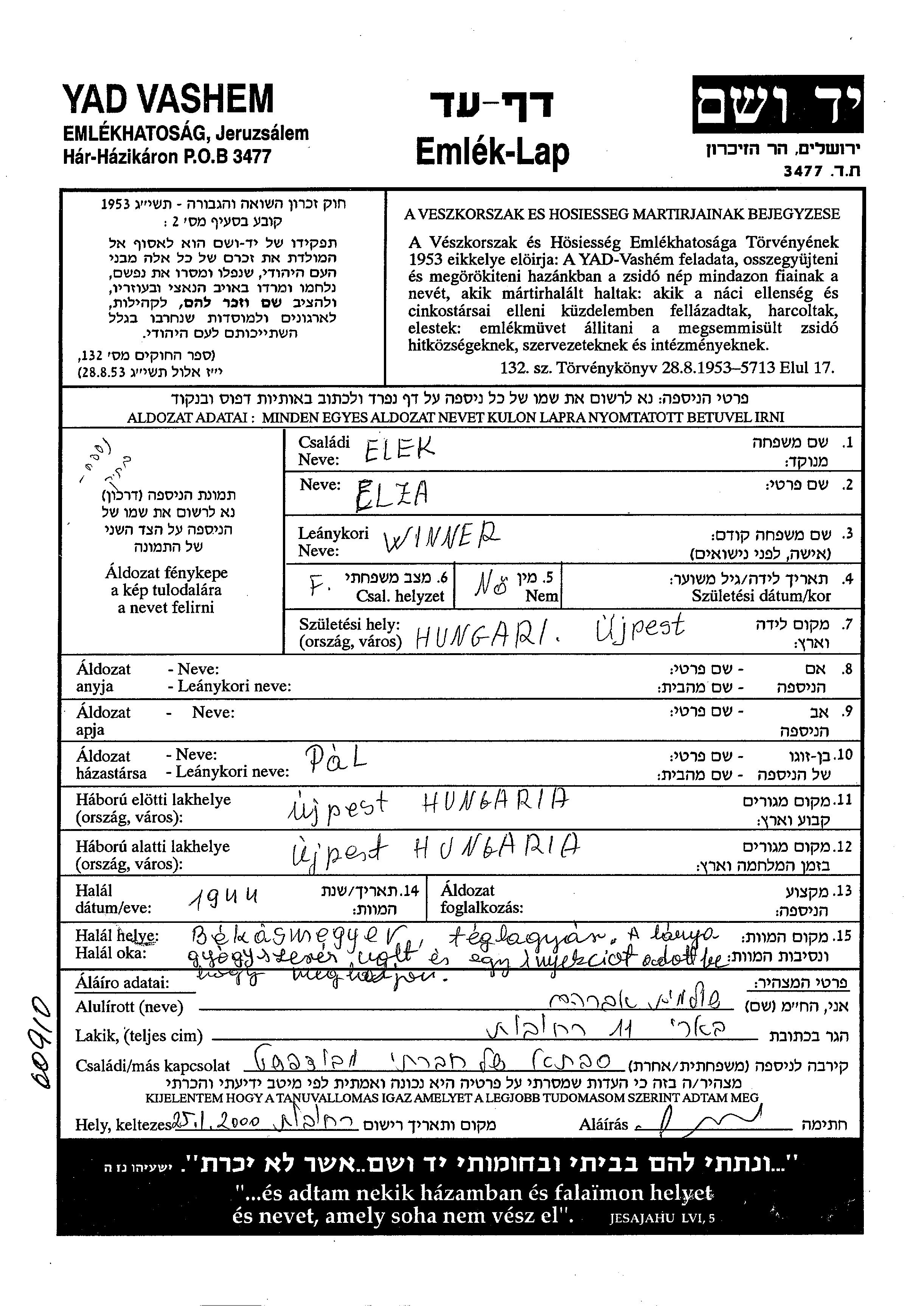 Elza Elek, geb. Winner wurde in Ujpest, Ungarn geboren. Sie war mit Pal Verheiratet. Vor dem Zweiten Weltkrieg lebte sie in Ujpest, Ungarn. Während des Krieges war sie in Ujpest, Ungarn.