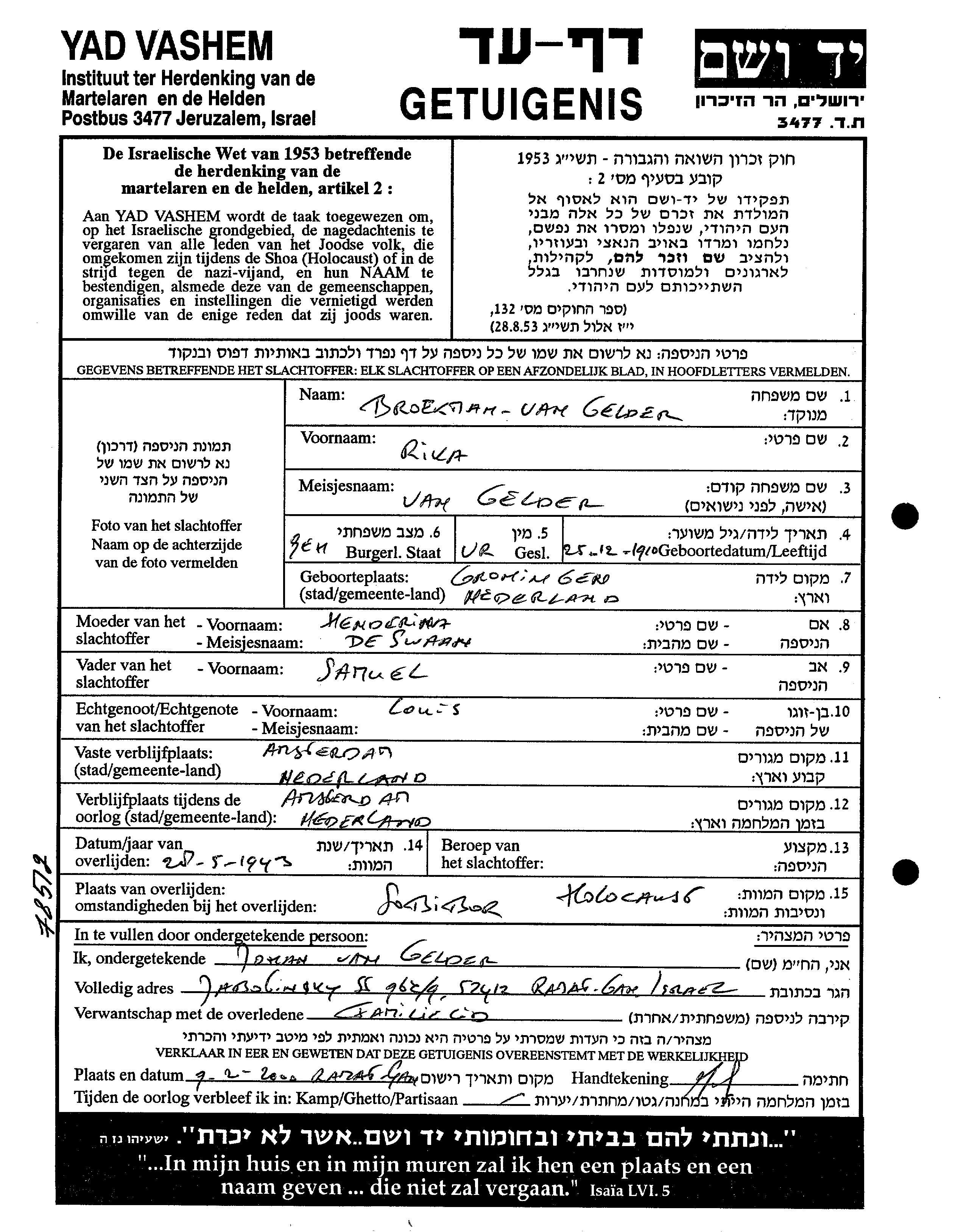 Rika Broekman, geb. Gelder van wurde im Jahr 1910 in Groningen, Niederlande geboren. Sie war die Tochter von Samuel und Henderina. Sie war mit Louis Verheiratet. Vor dem Zweiten Weltkrieg lebte sie in Amsterdam, Niederlande. Während des Krieges war sie in Amsterdam, Niederlande.